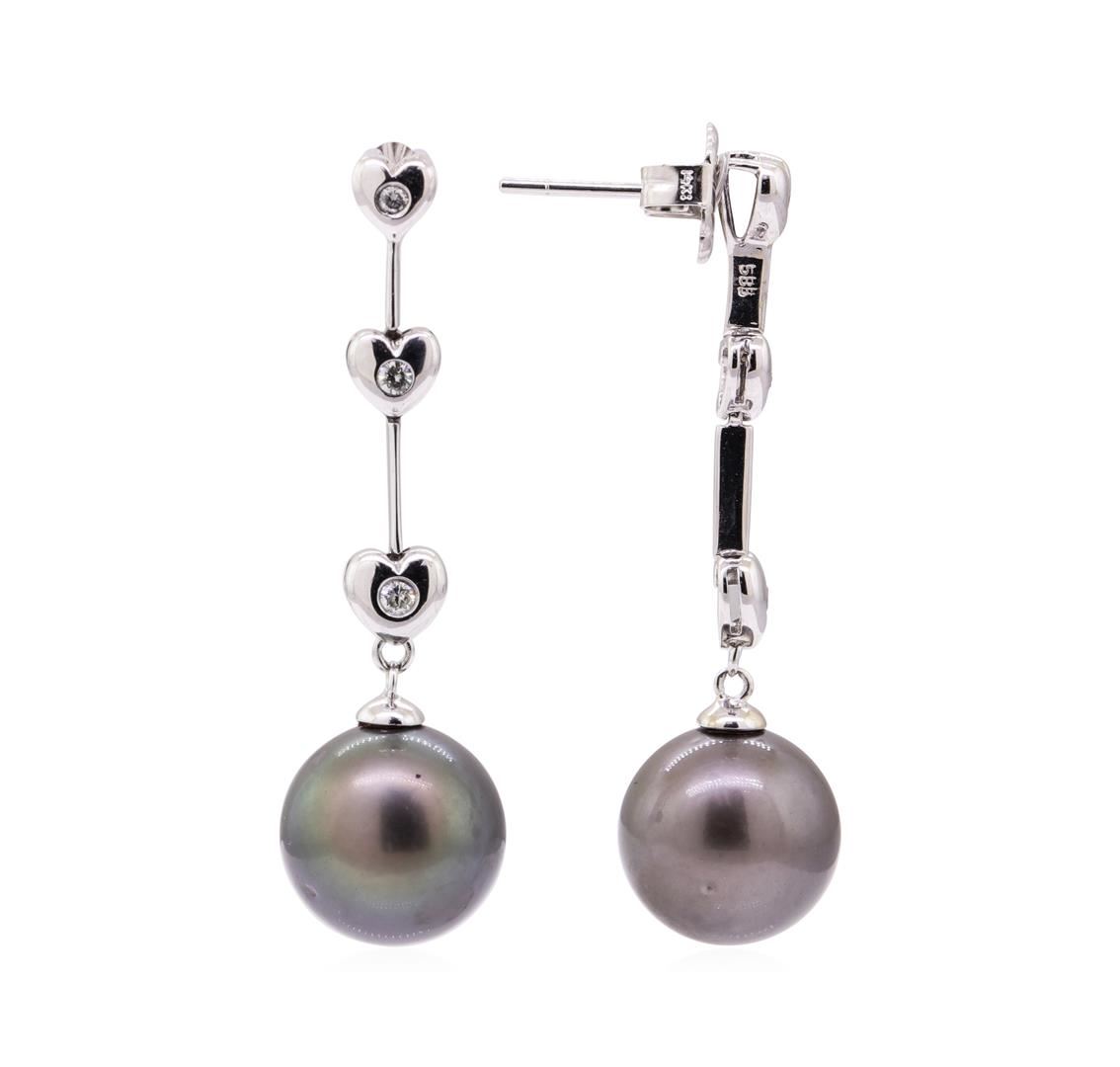 One pair of dangle earrings featuring: 14KT white gold weighing 7.2 grams containing diamonds weighing 0.15ctw and two black Tahitian pearls measuring 11.5mm in diameter. The diamonds are set in heart shaped links. The earrings have a drop of approximately 41 millimeters.