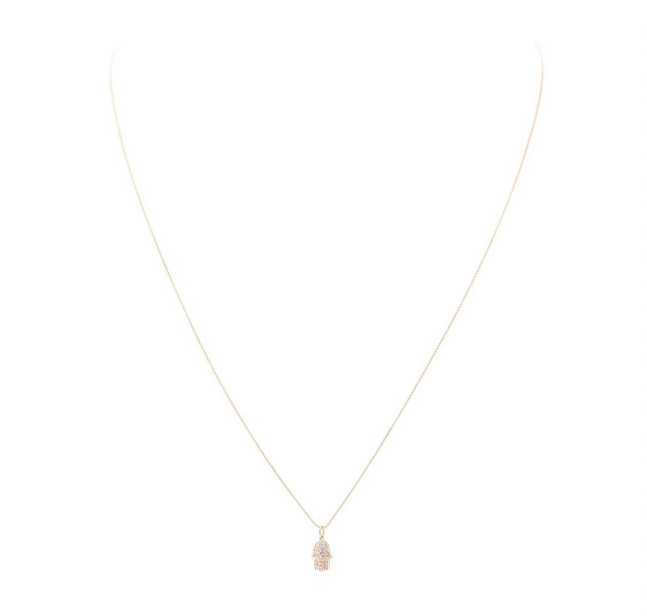 One Hamsa pendant with chain featuring: 14KT rose gold weighing 2.1 grams containing diamonds weighing 0.15ctw. The chain is a 0.7mm rope link chain measuring twenty-four inches in length.