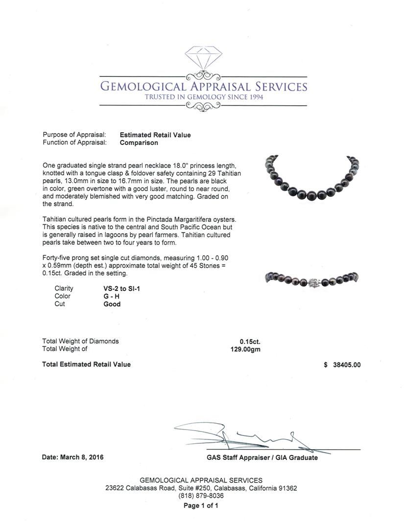 One graduated single strand pearl necklace 18.0" princess length, knotted with a tongue clasp & foldover safety containing 29 Tahitian pearls, 13.0mm in size to 16.7mm in size. The pearls are black in color, green overtone with a good luster, round to near round, and moderately blemished with very good matching. Graded on the strand. Tahitian cultured pearls form in the Pinctada Margaritifera oysters. This species is native to the central and South Pacific Ocean but is generally raised in lagoons by pearl farmers. Tahitian cultured pearls take between two to four years to form. Forty-Five prong set single cut diamonds, measuring 1.00 - 0.90 x 0.59mm (depth est.) approximate total weight of 45 Stones = 0.15ct. Graded in the setting. Clarity: VS-2 to SI-1. Color: G - Good. Total Weight of Diamonds 0.15ct. Total Weight of 129.00gm. GAS Appraised at $38,405.00.