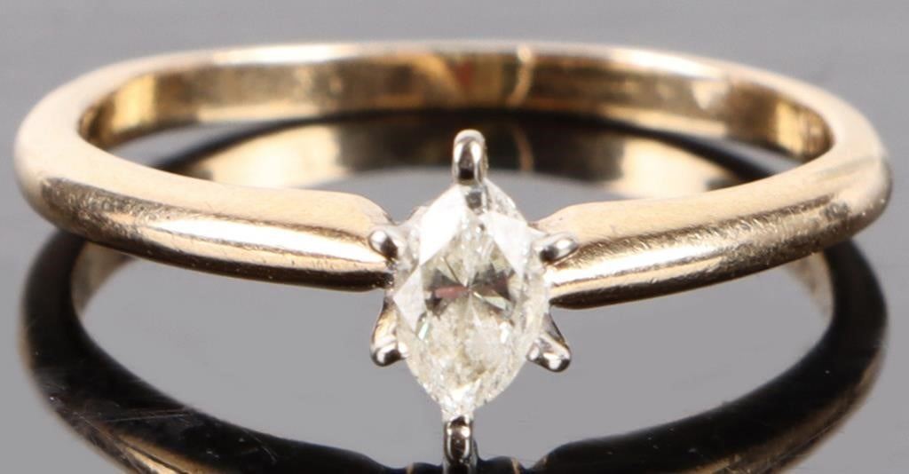 0.15ct marquise diamond 14k yellow gold ladies ring.