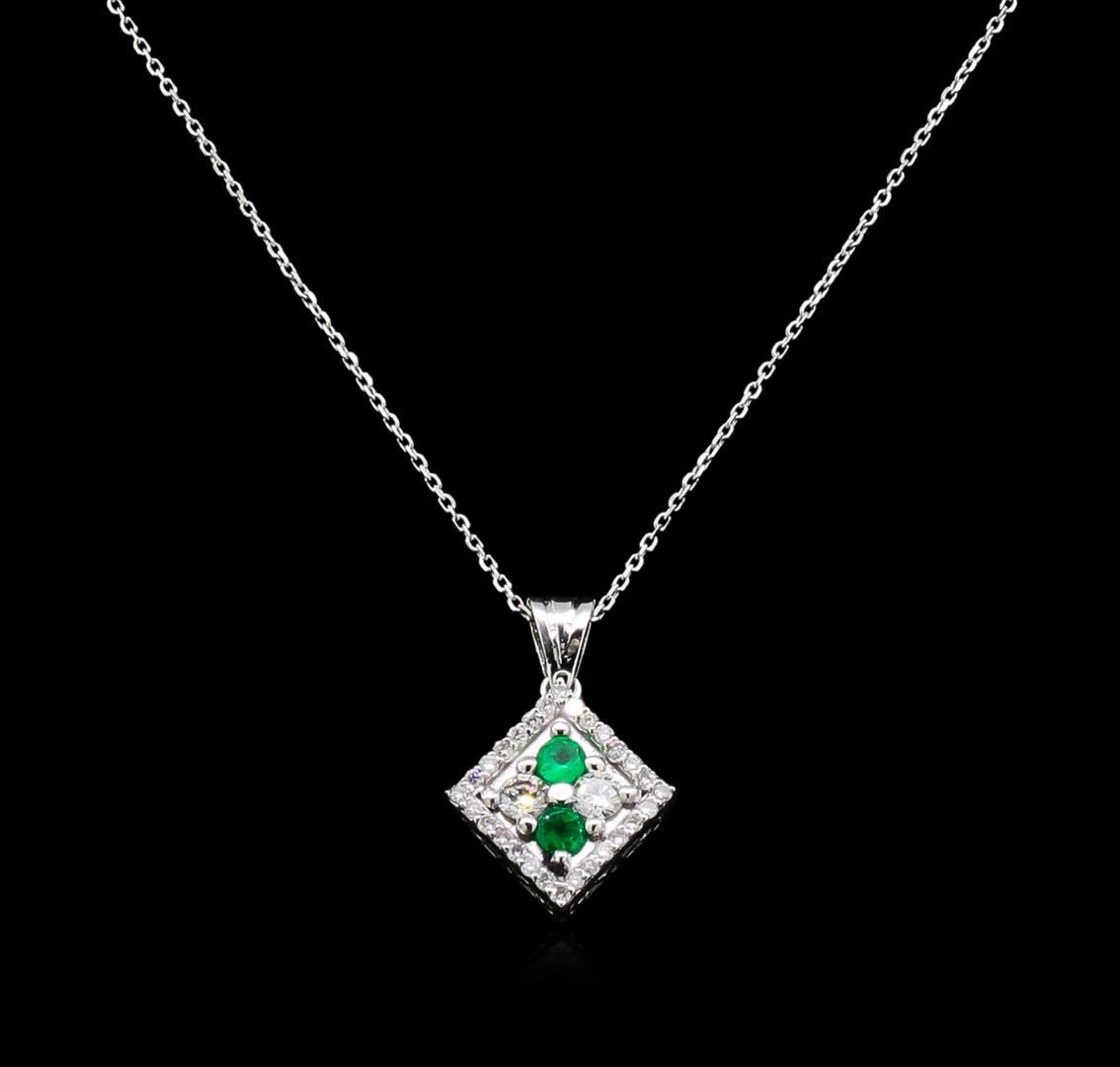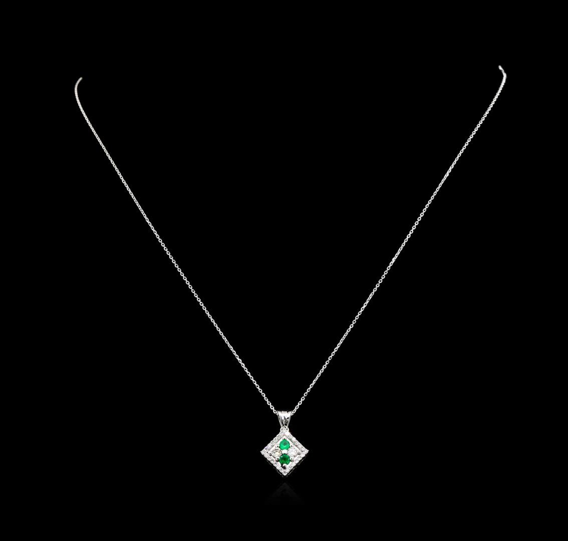 One pendant with chain featuring: 14KT white gold weighing 1.98 grams containing emeralds with a total weight of 0.15ct and diamonds with a total weight of 0.26ct.