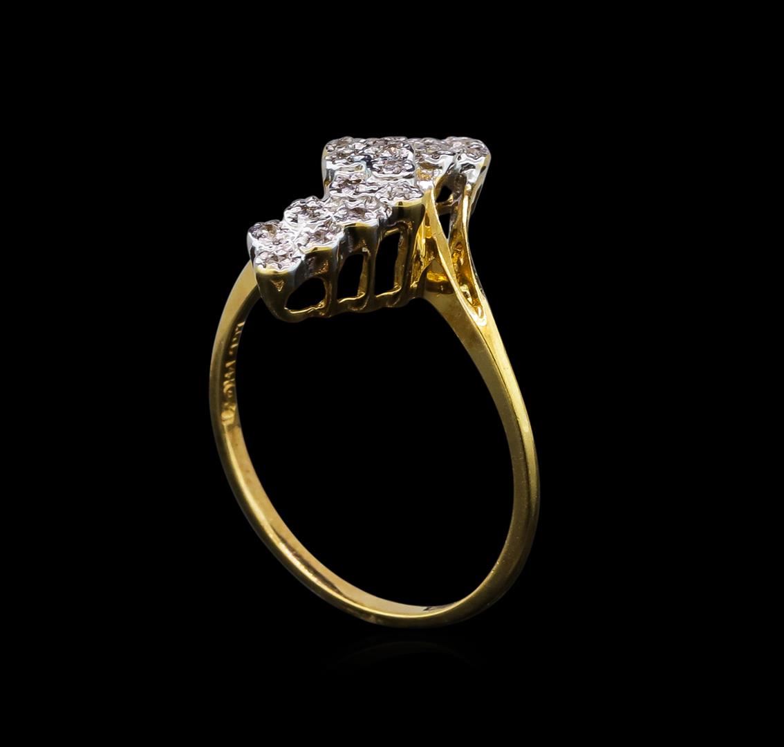 One electronically tested 14KT yellow and white gold lady's cast waterfall ring with a bright polish finish. The featured lady's ring has a shank measuring 1.40 millimeters wide. Identified with markings of '14K'. Condition is used, good workmanship. Containing: Sixteen prong set single cut diamonds, measuring 1.40 - 1.35 x 0.86mm (depth est.) approximate total weight of 16 Stones = 0.16ct. Graded in the setting. Clarity I-1 to I-2. Color: I - J Cut Good. Total Weight of Diamonds 0.16ct.. Total Weight of Ring 2.00gm. GAS Appraised at $680.00.