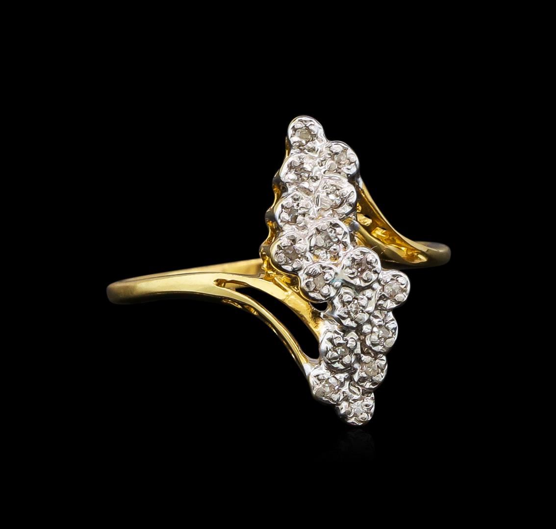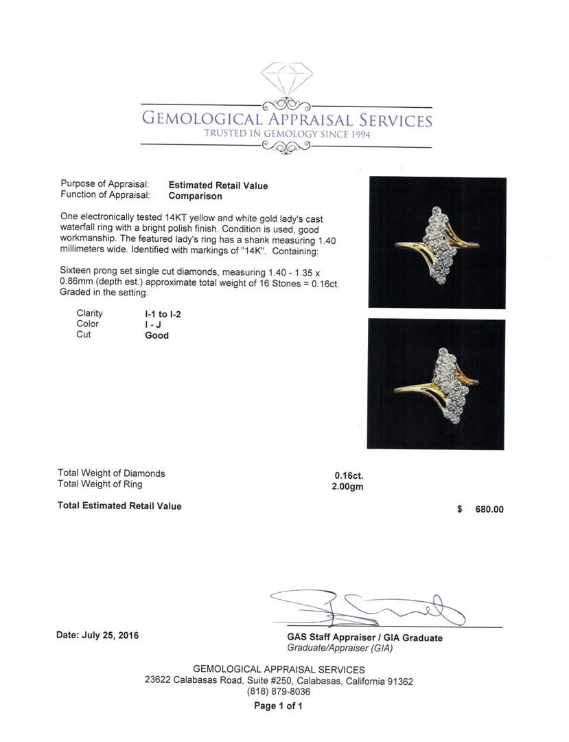 One electronically tested 14KT yellow and white gold lady's cast waterfall ring with a bright polish finish. The featured lady's ring has a shank measuring 1.40 millimeters wide. Identified with markings of '14K'. Condition is used, good workmanship. Containing: Sixteen prong set single cut diamonds, measuring 1.40 - 1.35 x 0.86mm (depth est.) approximate total weight of 16 Stones = 0.16ct. Graded in the setting. Clarity I-1 to I-2. Color: I - J Cut Good. Total Weight of Diamonds 0.16ct.. Total Weight of Ring 2.00gm. GAS Appraised at $680.00.