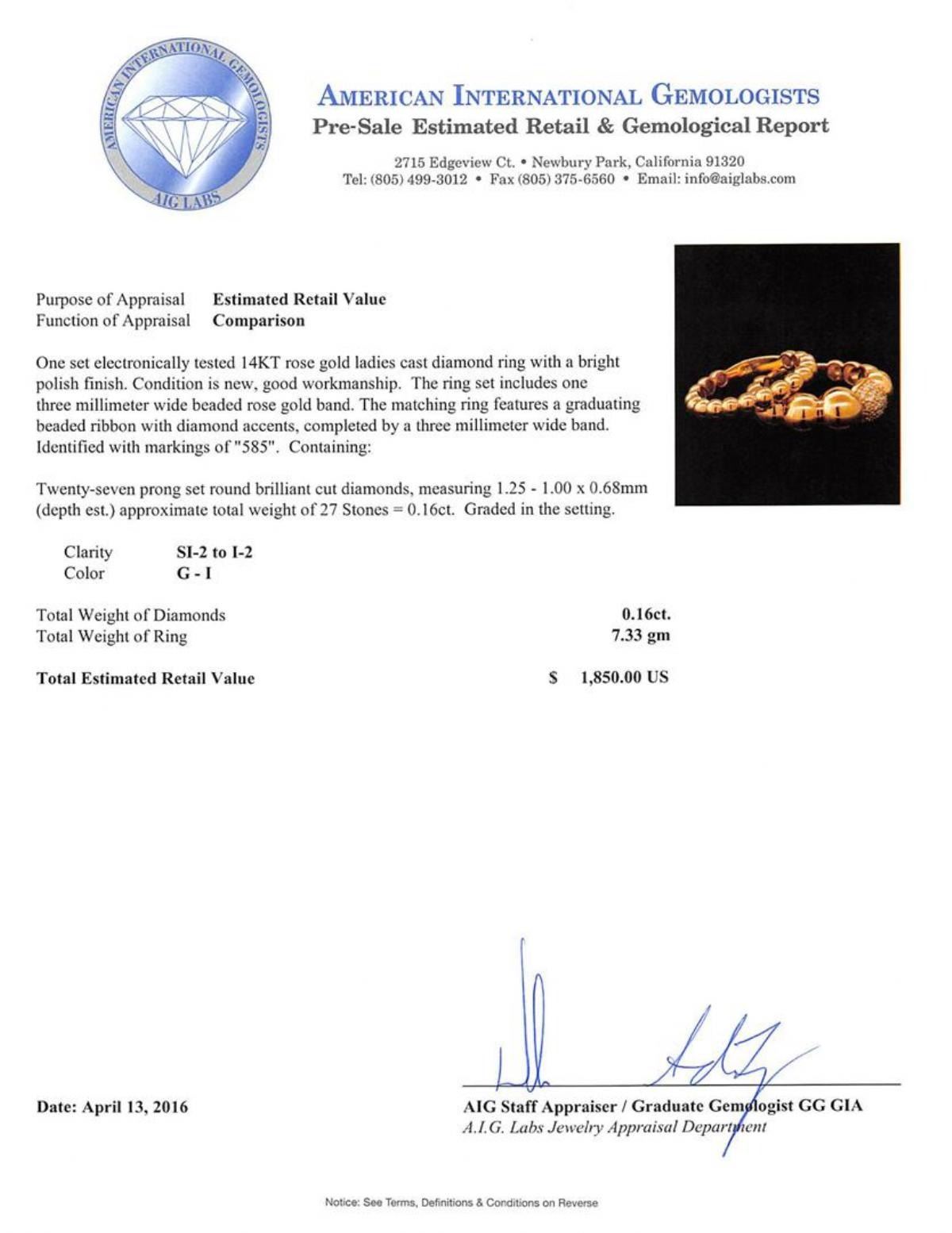One set electronically tested 14KT rose gold ladies cast diamond ring with a bright polish finish. The ring set includes one three millimeter wide beaded rose gold band. The matching ring features a graduating beaded ribbon with diamond accents, completed by a three millimeter wide band. Identified with markings of "585". Condition is new, good workmanship. Containing: Twenty-Seven prong set round brilliant cut diamonds, measuring 1.25 - 1.00 x 0.68mm (depth est.) approximate total weight of 27 Stones = 0.16ct. Graded in the setting. Clarity: SI-2 to I-2. Color: G - I. Total Weight of Diamonds 0.16ct. Total Weight of Ring 7.33gm. AIG Appraised.