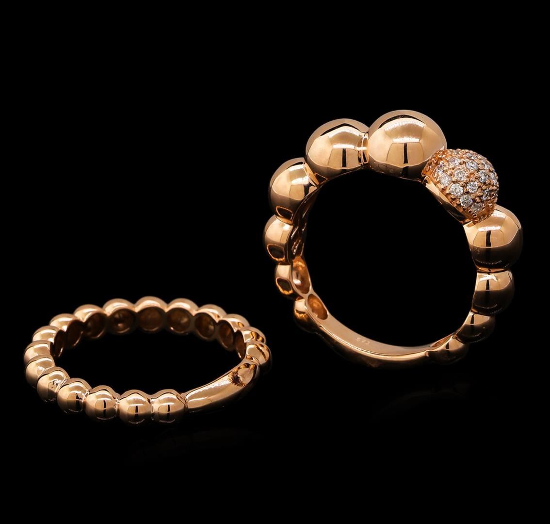 One set electronically tested 14KT rose gold ladies cast diamond ring with a bright polish finish. The ring set includes one three millimeter wide beaded rose gold band. The matching ring features a graduating beaded ribbon with diamond accents, completed by a three millimeter wide band. Identified with markings of "585". Condition is new, good workmanship. Containing: Twenty-Seven prong set round brilliant cut diamonds, measuring 1.25 - 1.00 x 0.68mm (depth est.) approximate total weight of 27 Stones = 0.16ct. Graded in the setting. Clarity: SI-2 to I-2. Color: G - I. Total Weight of Diamonds 0.16ct. Total Weight of Ring 7.33gm. AIG Appraised.