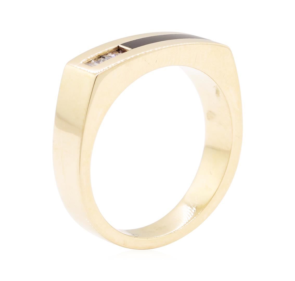 One men's ring featuring: 14KT yellow gold weighing 10.5 grams containing one piece of inlaid black onyx and diamonds weighing 0.16ctw.