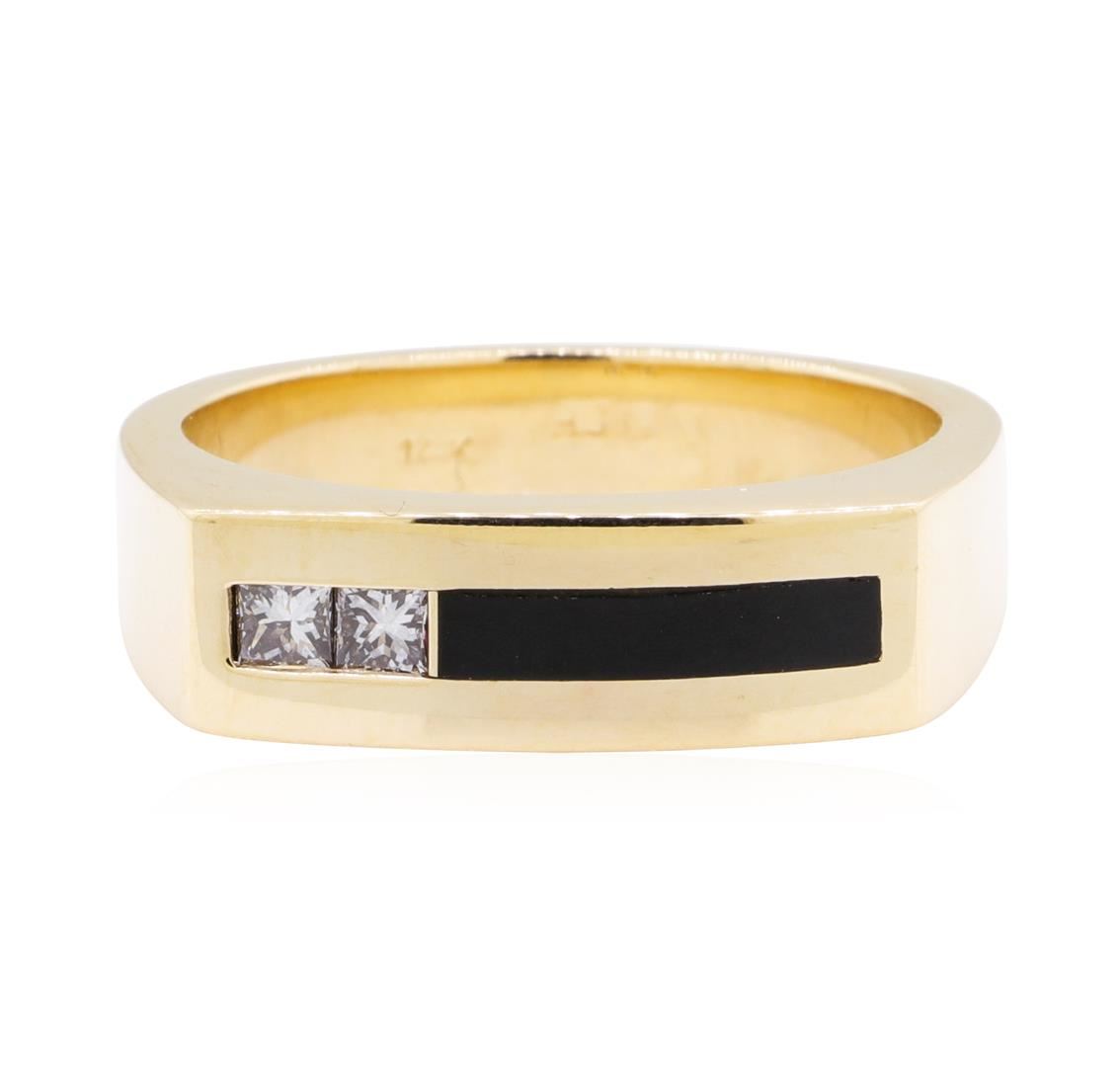 One men's ring featuring: 14KT yellow gold weighing 10.5 grams containing one piece of inlaid black onyx and diamonds weighing 0.16ctw.