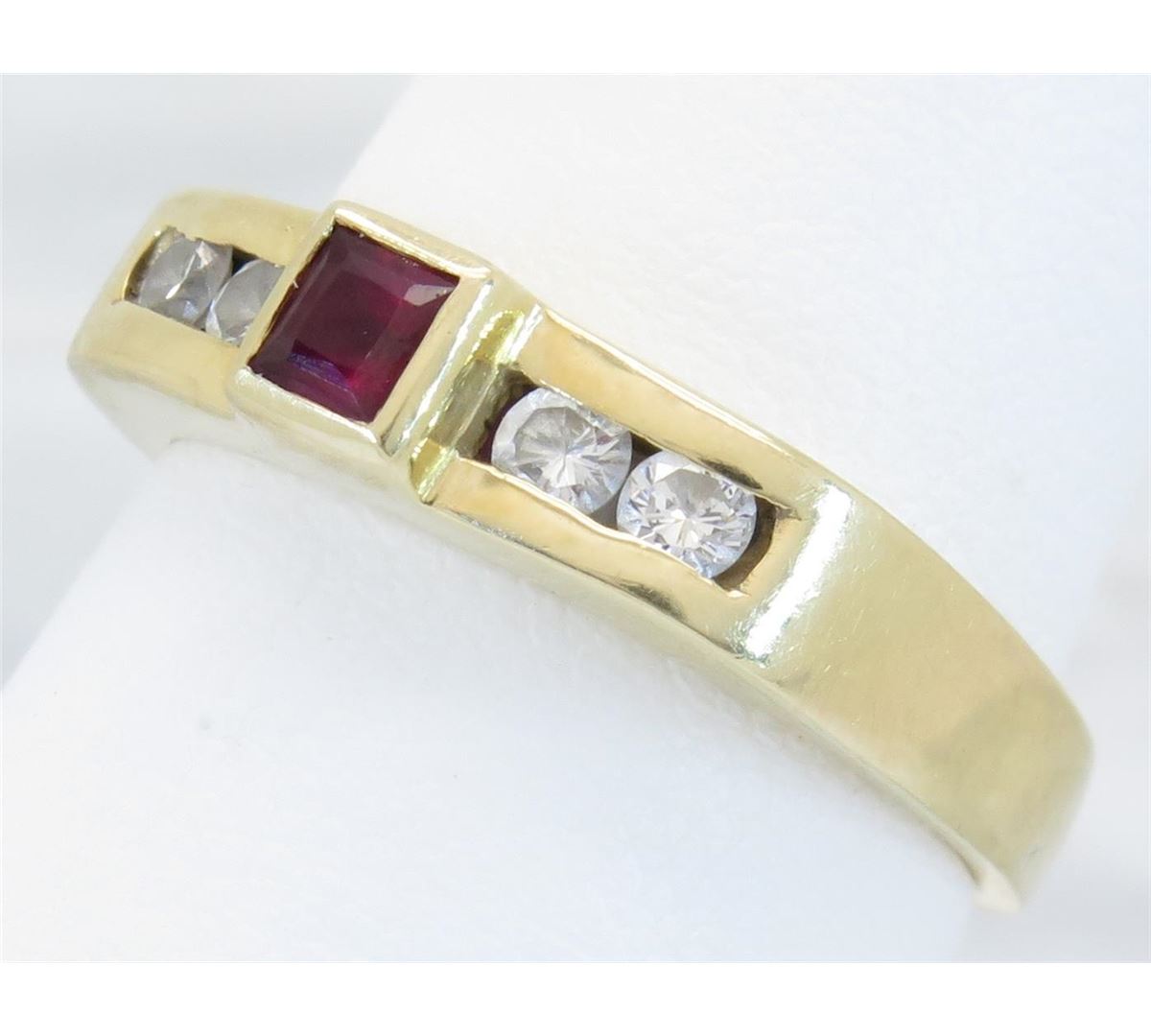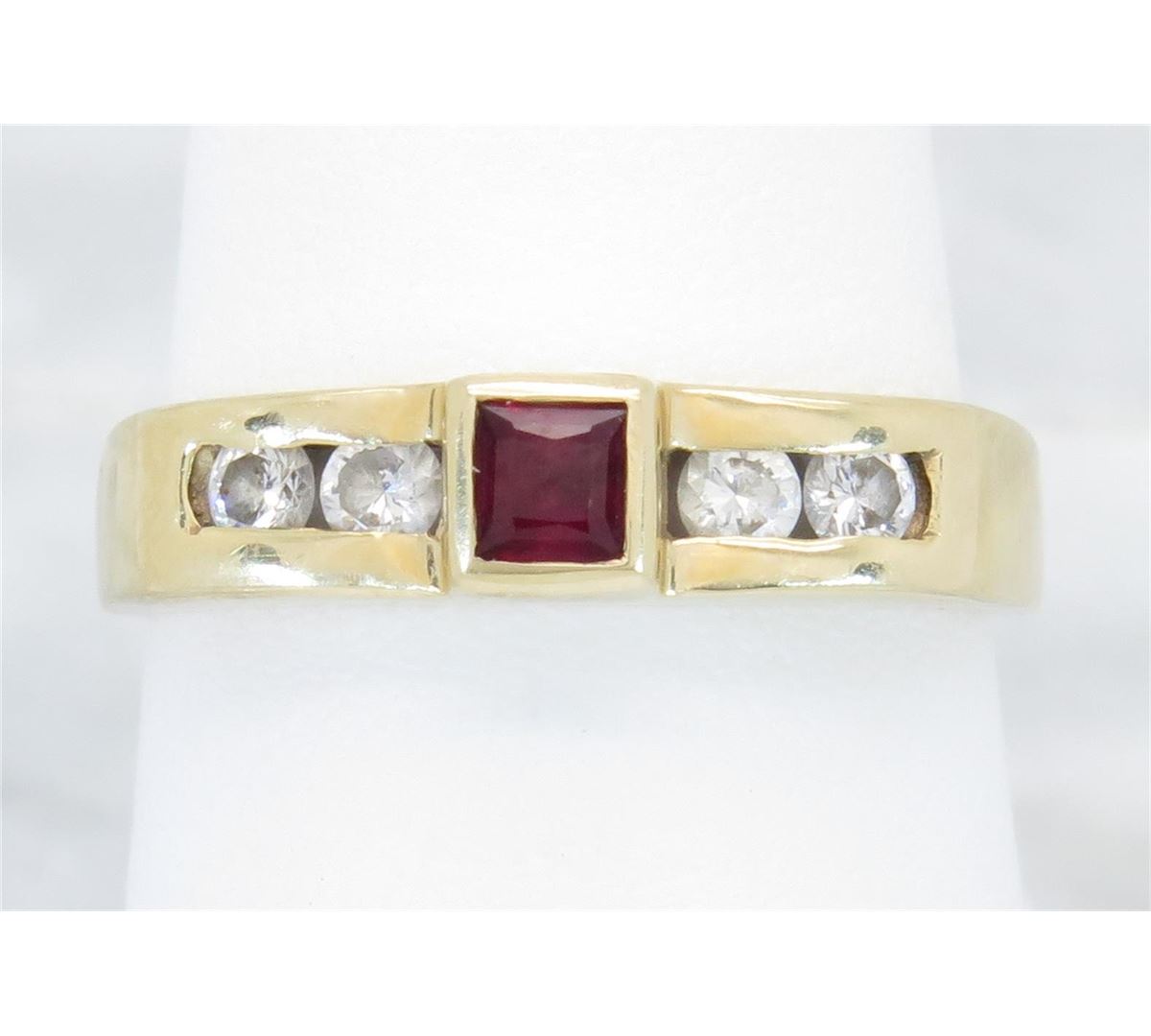 One tested 14K yellow gold diamond and ruby ring. Containing: One 3.0MM X 3.1MM .16CT Ruby, 4 Round Brilliant Cut Diamonds. Approximate total diamond weight: .18CTW. Diamonds are graded in the mounting, unless otherwise stated. Weight: 3.5 grams, Size: 5.75.