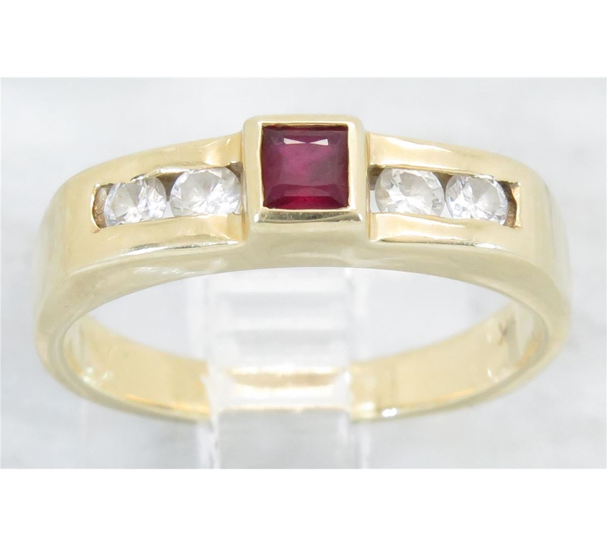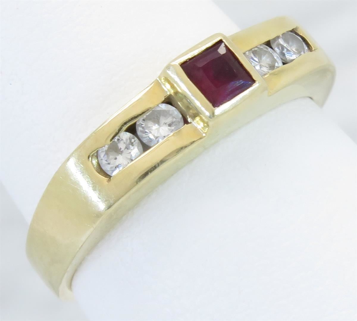 One tested 14K yellow gold diamond and ruby ring. Containing: One 3.0MM X 3.1MM .16CT Ruby, 4 Round Brilliant Cut Diamonds. Approximate total diamond weight: .18CTW. Diamonds are graded in the mounting, unless otherwise stated. Weight: 3.5 grams, Size: 5.75.