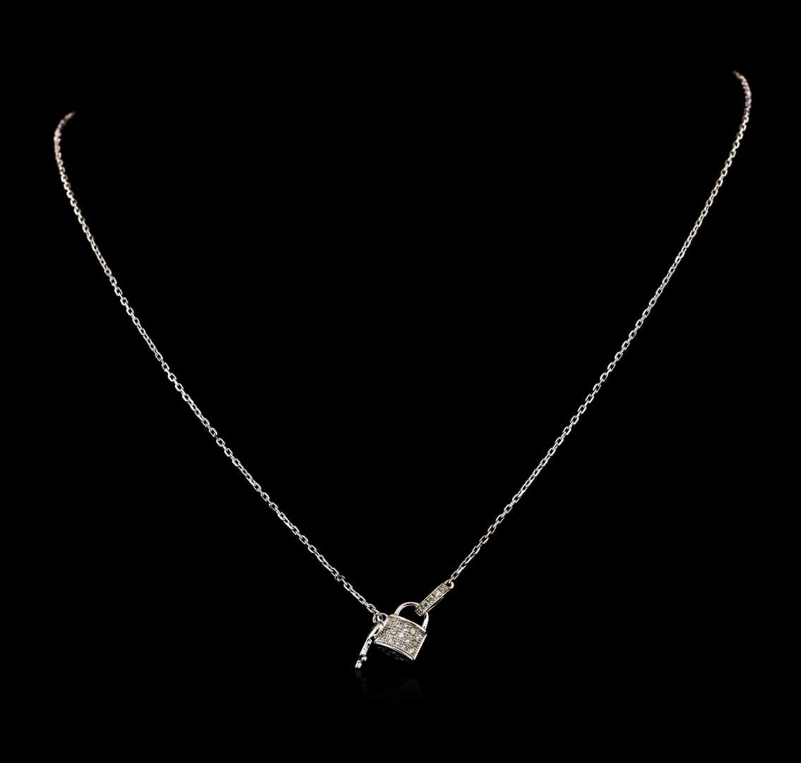 One lock and key pendant with chain featuring: 14KT white gold weighing 2.99 grams containing diamonds with a total weight of 0.16ct.