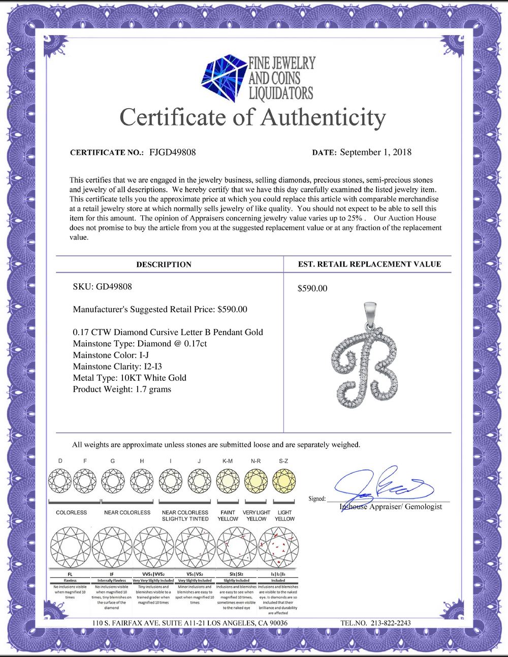 REF-14X9Y- SKU: GD49808 ---- 0.17 CTW Diamond Cursive Letter B Pendant 10KT White Gold