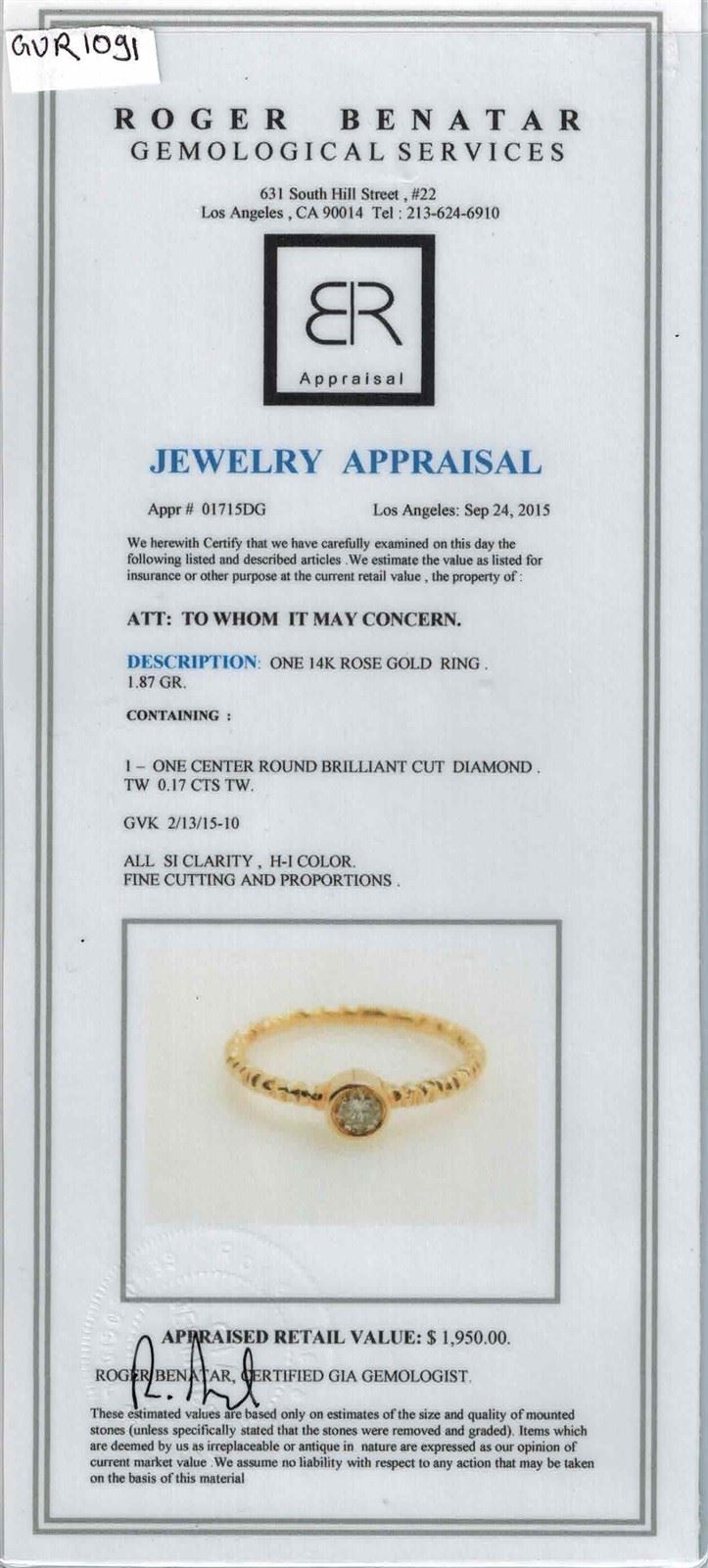 14K ROSE GOLD NATURAL DIAMOND RING:1.87 GRAMS/DIAMOND:0.17CT//#GVR1091 **Artfully crafted in 14k rose gold, this 0.17ct Round Brilliant Cut Bezel Setting Diamond Solitaire sparkles dynamically. A stone of mental and psychic activation, Diamonds promote truth, vision and alignment with the higher mind, for those who use them consciously. This engagement ring has a scrolling detailed shank adding textural appeal.**