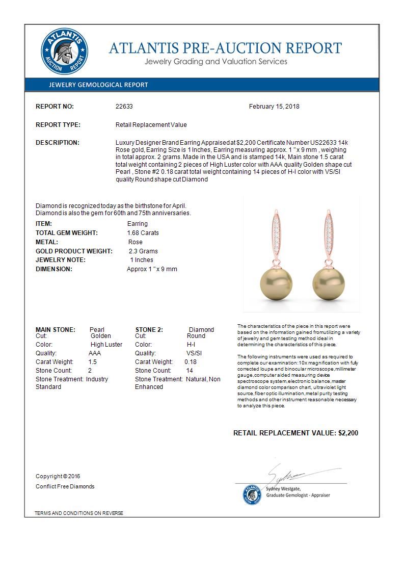 REF-30H9A -22633 ---- 0.18 CTW Micro Pave VS/SI Diamond & Golden Pearl Designer Earrings 14K Rose Gold ---- Luxury Designer Brand Earring Appraised at $2,200 Certificate Number US22633 14k Rose gold, Earring Size is 1 Inches, Earring measuring approx. 1 " x 9 mm , weighing in total approx. 2 grams. Made in the USA and is stamped 14k, Main stone 1.5 carat total weight containing 2 pieces of High Luster color with AAA quality Golden shape cut Pearl , Stone #2 0.18 carat total weight containing 14 pieces of H-I color with VS/SI quality Round shape cut Diamond