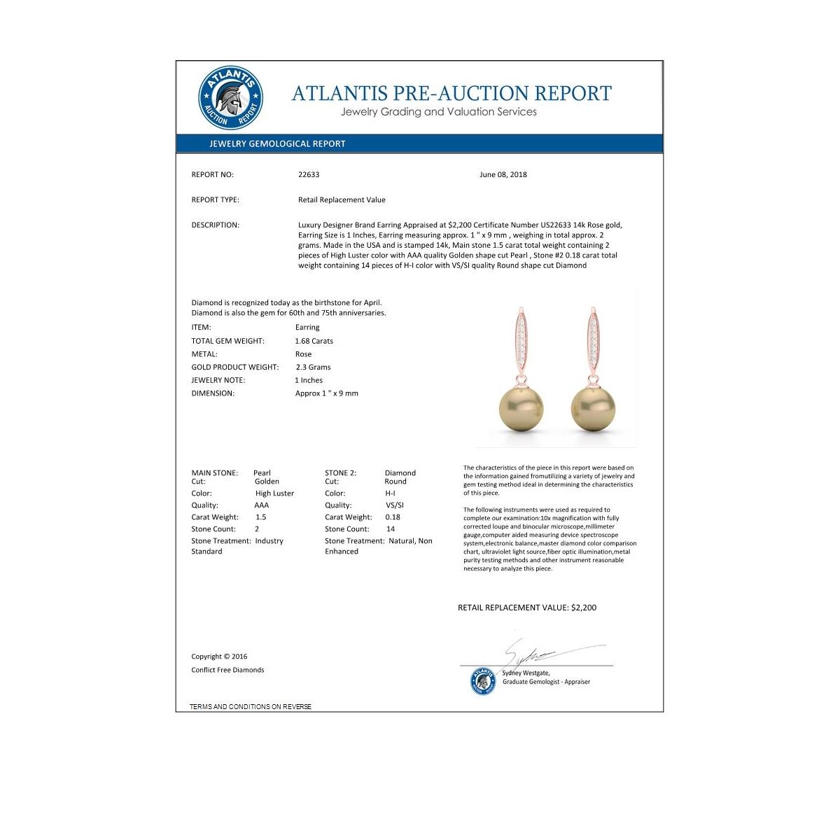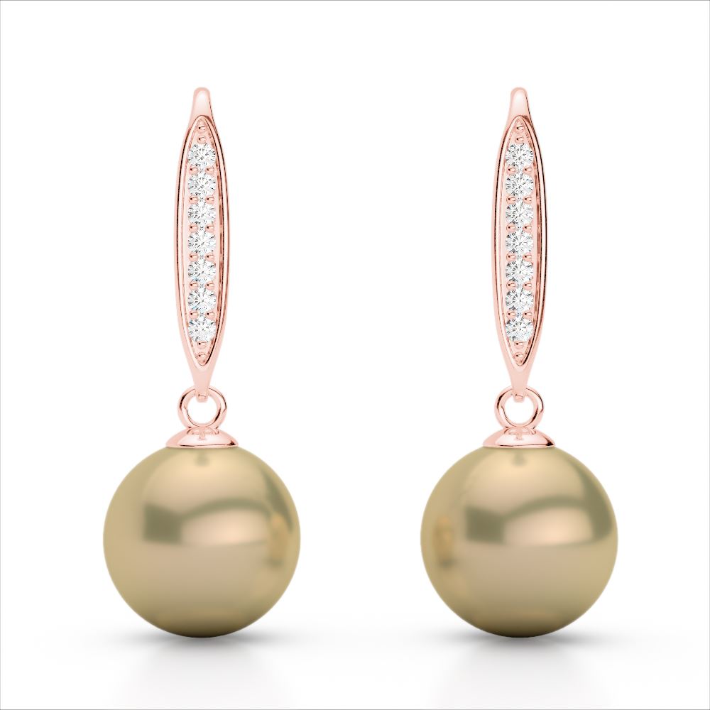 REF-30H9A -22633 ---- 0.18 CTW Micro Pave VS/SI Diamond & Golden Pearl Designer Earrings 14K Rose Gold ---- Luxury Designer Brand Earring Appraised at $2,200 Certificate Number US22633 14k Rose gold, Earring Size is 1 Inches, Earring measuring approx. 1 " x 9 mm , weighing in total approx. 2 grams. Made in the USA and is stamped 14k, Main stone 1.5 carat total weight containing 2 pieces of High Luster color with AAA quality Golden shape cut Pearl , Stone #2 0.18 carat total weight containing 14 pieces of H-I color with VS/SI quality Round shape cut Diamond