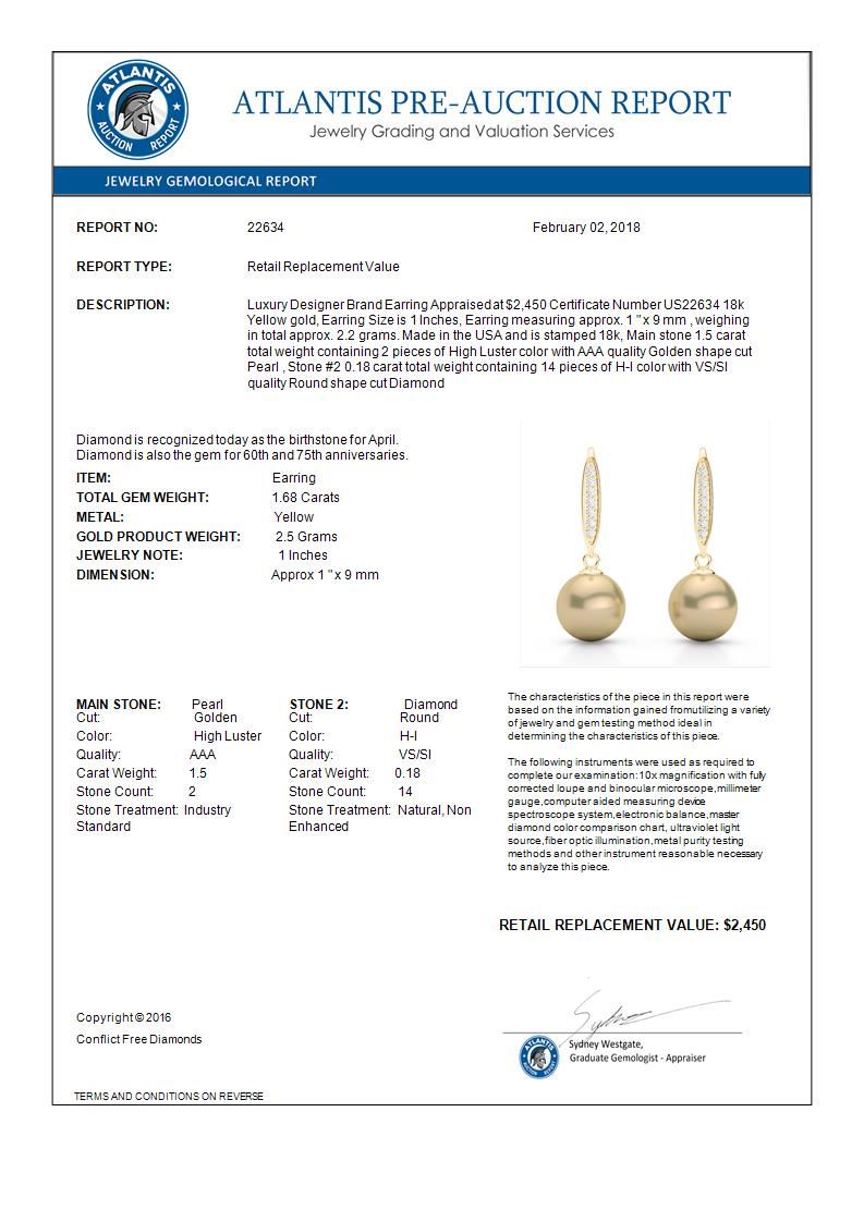 REF-34X5T -22634 ---- 0.18 CTW Micro Pave VS/SI Diamond & Golden Pearl Designer Earrings 18K Yellow Gold ---- Luxury Designer Brand Earring Appraised at $2,450 Certificate Number US22634 18k Yellow gold, Earring Size is 1 Inches, Earring measuring approx. 1 " x 9 mm , weighing in total approx. 2.2 grams. Made in the USA and is stamped 18k, Main stone 1.5 carat total weight containing 2 pieces of High Luster color with AAA quality Golden shape cut Pearl , Stone #2 0.18 carat total weight containing 14 pieces of H-I color with VS/SI quality Round shape cut Diamond