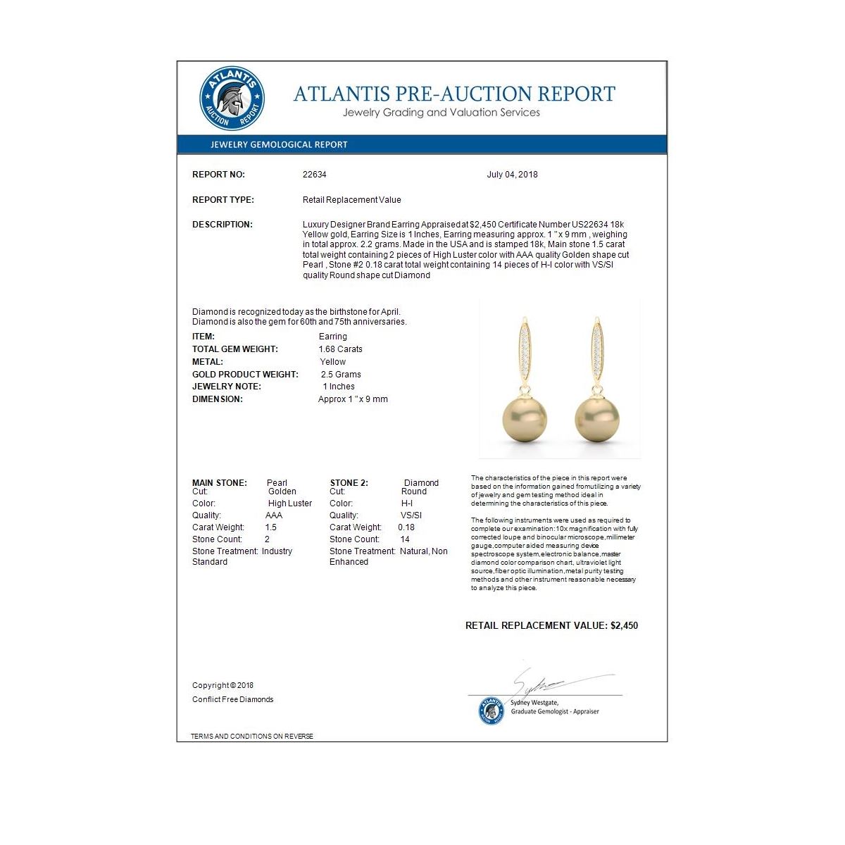 REF-34X5T -22634 ---- 0.18 CTW Micro Pave VS/SI Diamond & Golden Pearl Designer Earrings 18K Yellow Gold ---- Luxury Designer Brand Earring Appraised at $2,450 Certificate Number US22634 18k Yellow gold, Earring Size is 1 Inches, Earring measuring approx. 1 " x 9 mm , weighing in total approx. 2.2 grams. Made in the USA and is stamped 18k, Main stone 1.5 carat total weight containing 2 pieces of High Luster color with AAA quality Golden shape cut Pearl , Stone #2 0.18 carat total weight containing 14 pieces of H-I color with VS/SI quality Round shape cut Diamond