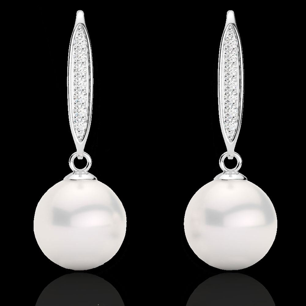 REF-34A5X -22636 ---- 0.18 CTW Micro VS/SI Diamond & Pearl Designer Earrings 18K White Gold ---- Luxury Designer Brand Earring Appraised at $2,450 Certificate Number US22636 18k White gold, Earring Size is 1 Inches, Earring measuring approx. 1 " x 9 mm , weighing in total approx. 2.2 grams. Made in the USA and is stamped 18k, Main stone 1.5 carat total weight containing 2 pieces of High Luster color with AAA quality White shape cut Pearl , Stone #2 0.18 carat total weight containing 14 pieces of H-I color with VS/SI quality Round shape cut Diamond