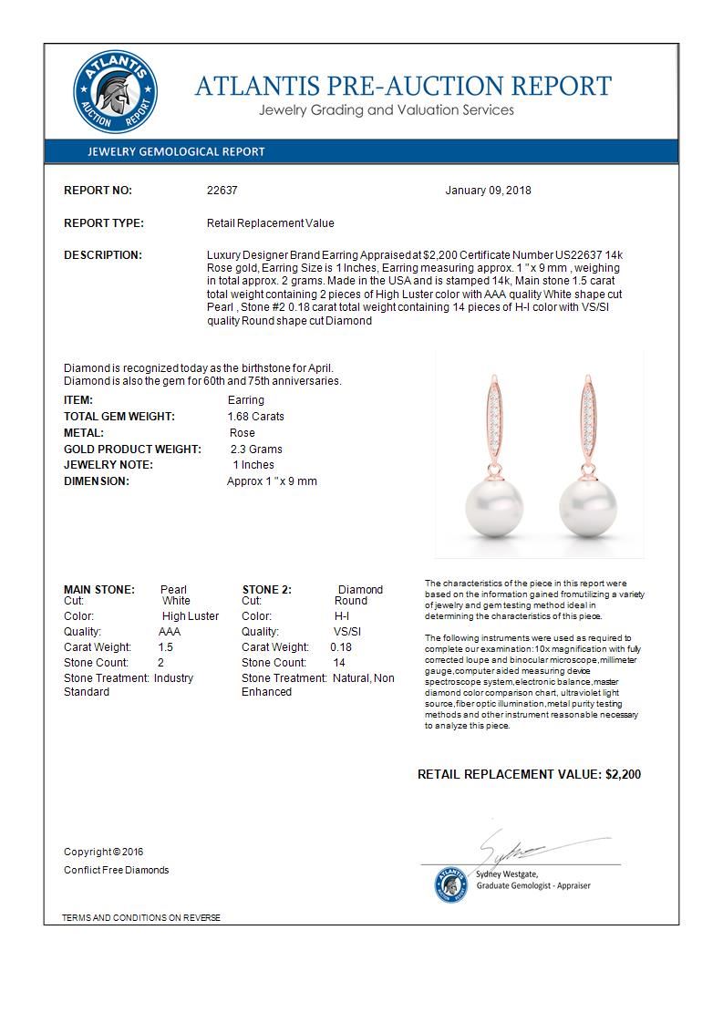 REF-30W9F -22637 ---- 0.18 CTW Micro VS/SI Diamond & White Pearl Designer Earrings 14K Rose Gold ---- Luxury Designer Brand Earring Appraised at $2,200 Certificate Number US22637 14k Rose gold, Earring Size is 1 Inches, Earring measuring approx. 1 " x 9 mm , weighing in total approx. 2 grams. Made in the USA and is stamped 14k, Main stone 1.5 carat total weight containing 2 pieces of High Luster color with AAA quality White shape cut Pearl , Stone #2 0.18 carat total weight containing 14 pieces of H-I color with VS/SI quality Round shape cut Diamond