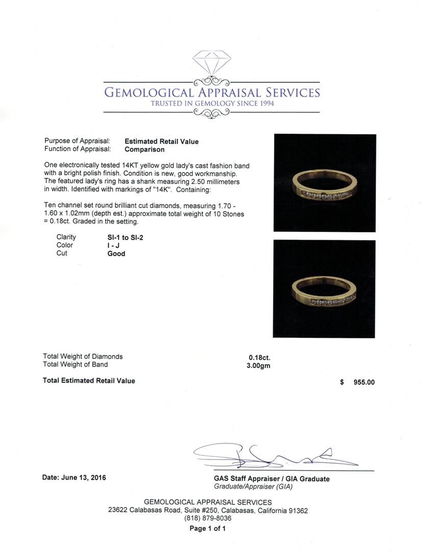 One electronically tested 14KT yellow gold lady's cast fashion band with a bright polish finish. The featured lady's ring has a shank measuring 2.50 millimeters in width. Identified with markings of "14K". Condition is new, good workmanship. Containing: Ten channel set round brilliant cut diamonds, measuring 1.70 - 1.60 x 1.02mm (depth est.) approximate total weight of 10 Stones = 0.18ct. Graded in the setting. Clarity: SI-1 to SI-2. Color: I - Good. Total Weight of Diamonds 0.18ct. Total Weight of Band 3.00gm. GAS Appraised at $955.00.