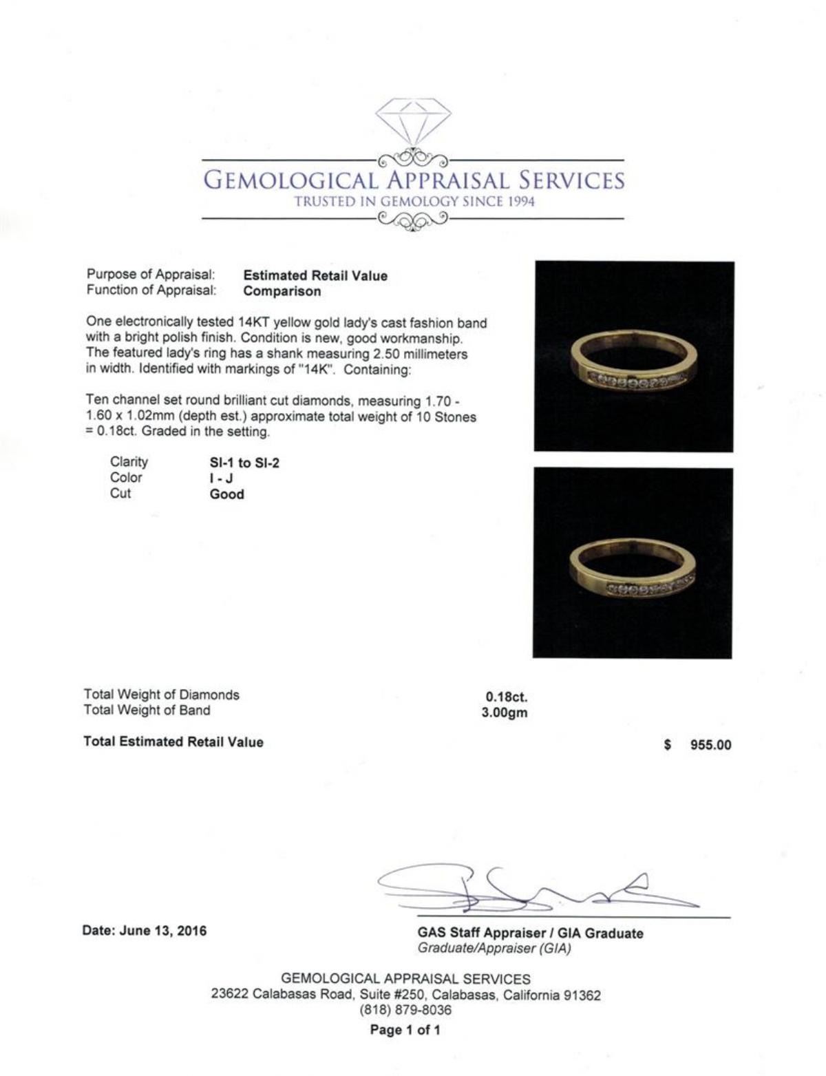 One electronically tested 14KT yellow gold lady's cast fashion band with a bright polish finish. The featured lady's ring has a shank measuring 2.50 millimeters in width. Identified with markings of "14K". Condition is new, good workmanship. Containing: Ten channel set round brilliant cut diamonds, measuring 1.70 - 1.60 x 1.02mm (depth est.) approximate total weight of 10 Stones = 0.18ct. Graded in the setting. Clarity: SI-1 to SI-2. Color: I - Good. Total Weight of Diamonds 0.18ct. Total Weight of Band 3.00gm. GAS Appraised.