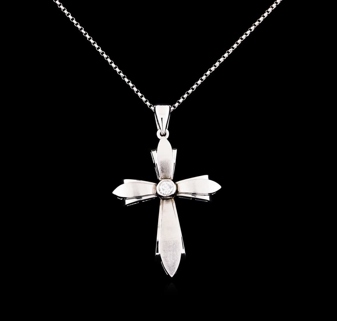 One cross pendant with chain featuring: 14KT white gold weighing 8.01 grams containing one diamond with a total weight of 0.18ct.