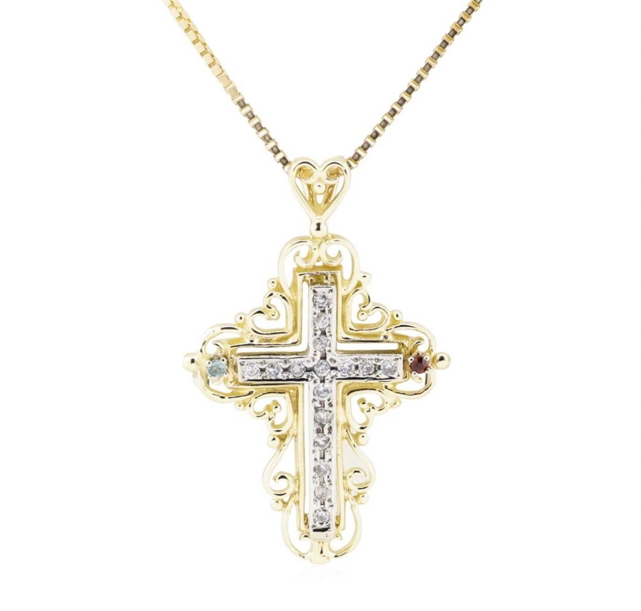 One cross pendant with a filigree scroll motif with an attached thirty inch long box chain featuring: 14KT yellow and white gold weighing 9.5 grams containing diamonds weighing 0.18ctw.