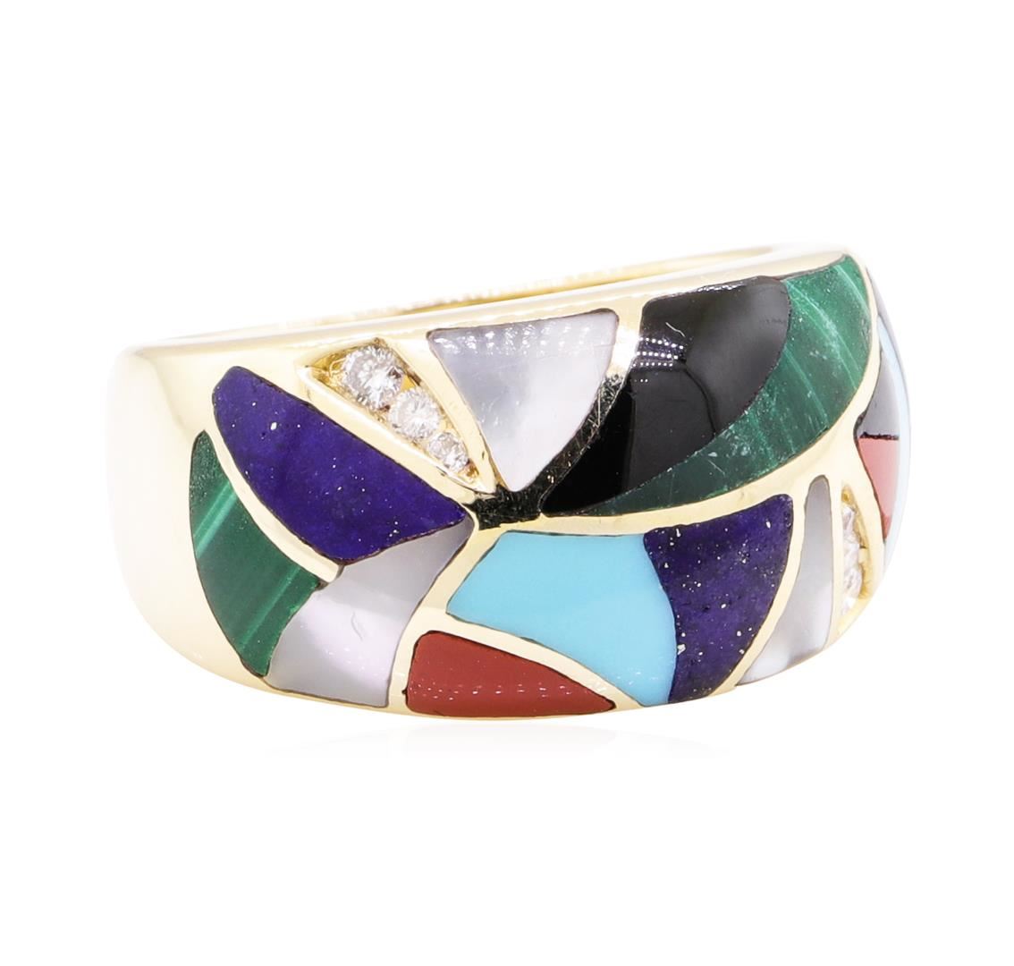 One electronically tested 14KT yellow gold lady's cast fashion ring with a wide band dome with a bright polish finish. The featured lady's ring has inlaid pieces of mother of pearl, lapis lazuli, malachite, onyx, turquoise and carnelian, and a shank measuring 4.0 millimeters wide. Trademark is ASH. Identified with markings of '14K'. Condition is new, good workmanship. Containing: Six channel set round brilliant cut diamonds, measuring 2.00 - 1.30 x 1.02mm (depth est.) approximate total weight of 6 Stones = 0.18ct. Graded in the setting. Color H - I Clarity SI-1 to SI-2 Cut Good. Total Weight of Diamonds 0.18ct.. Total Weight of Ring 9.30gm GAS Appraised at $2325.00. GAS Appraised.