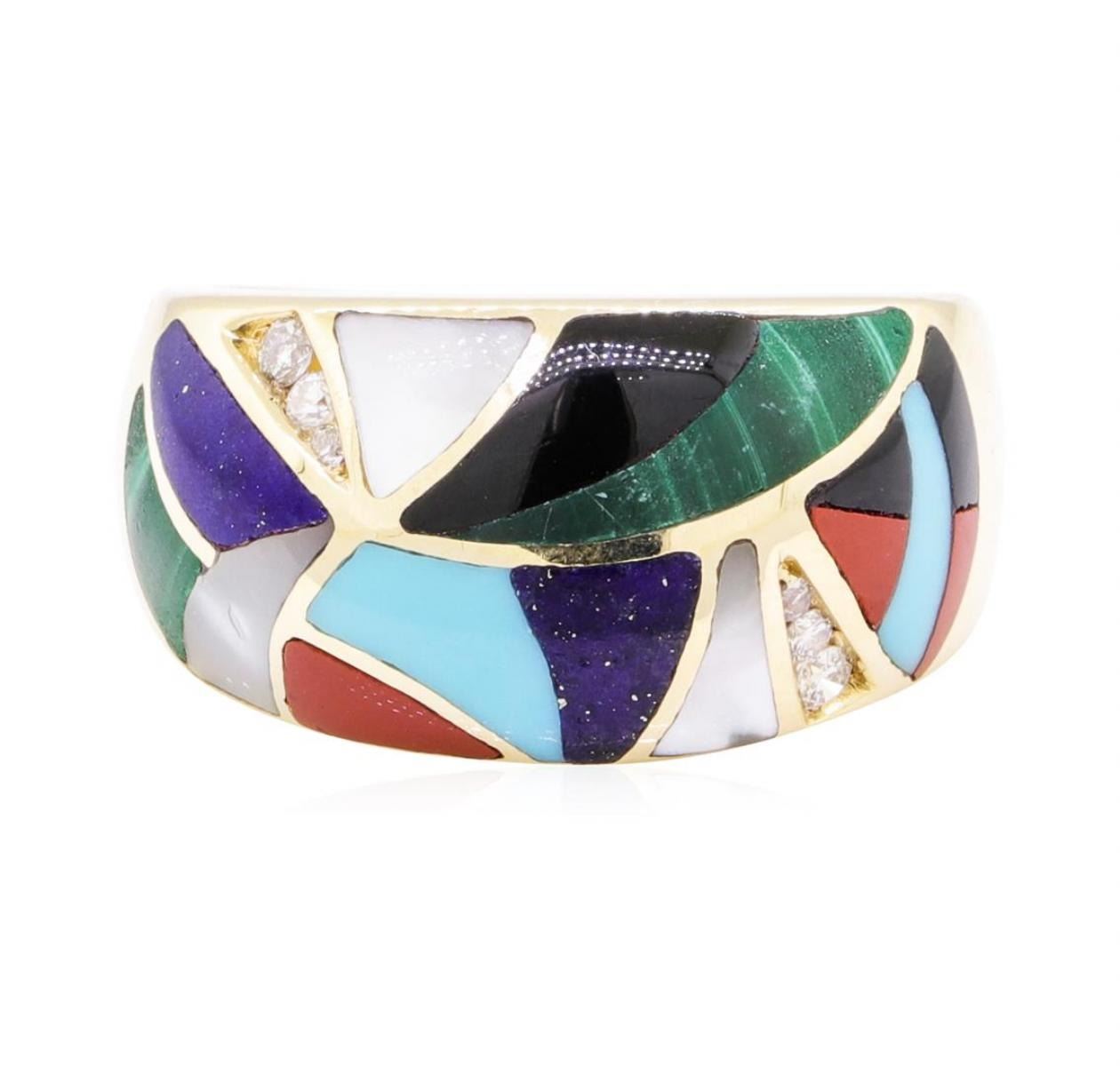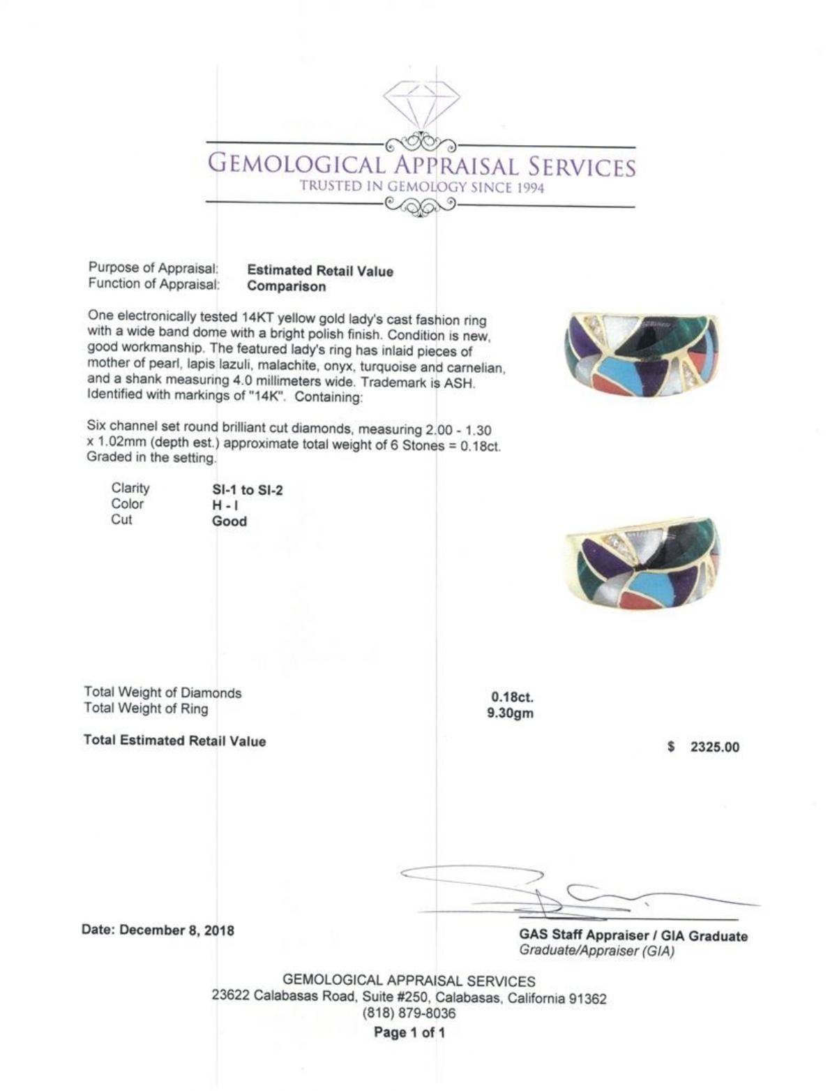 One electronically tested 14KT yellow gold lady's cast fashion ring with a wide band dome with a bright polish finish. The featured lady's ring has inlaid pieces of mother of pearl, lapis lazuli, malachite, onyx, turquoise and carnelian, and a shank measuring 4.0 millimeters wide. Trademark is ASH. Identified with markings of '14K'. Condition is new, good workmanship. Containing: Six channel set round brilliant cut diamonds, measuring 2.00 - 1.30 x 1.02mm (depth est.) approximate total weight of 6 Stones = 0.18ct. Graded in the setting. Color H - I Clarity SI-1 to SI-2 Cut Good. Total Weight of Diamonds 0.18ct.. Total Weight of Ring 9.30gm GAS Appraised at $2325.00. GAS Appraised.