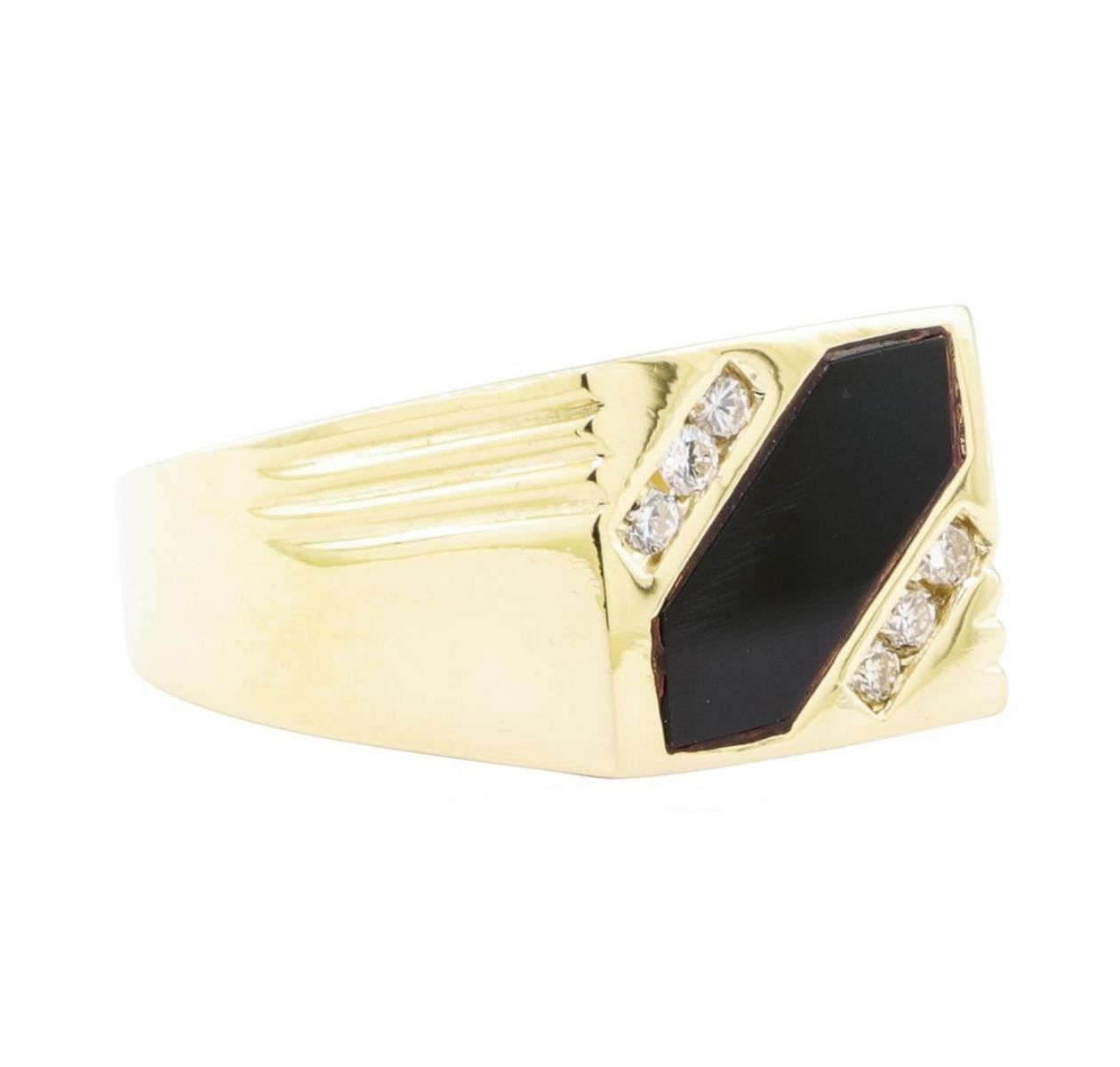 One mens' ring featuring: 14KT yellow gold weighing 8.8 grams containing one piece of inlaid onyx and diamonds weighing 0.18ctw.