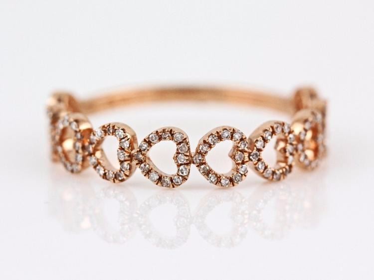|**Total Carat Weight:0.18|**Clarity:SI2-SI3|**Cut:Verry Good|**Setting: Pave Set |**Main Stone:|**MAIN Stone Treatment:Not Enhanced|**Main Stone Color:|**Main Stone Color:Round|**Theme:|**Length Inches:|**Ring Size:|**Style:Stackable Band|**Metal Purity:14k|**Metal:Rose Gold|**Gold Weight:1.75g|**Dimension:|**Diamond Color:F-G|**Sizable:|**Sizable:A brand-new, unused, and unworn item (including handmade items) in the original packaging (such as the original box or bag) and/or with the original tags attached|**Remarks: Colorless Diamonds, With no visible inclusions to the unaided eye. 0.18ct - 120 pcs - 0.7mm Round Clear Diamond (Not Enhanced) SETTING: Pave Set HEART DIMENSION: 4.3mm x 4mm each. (10 Hearts) RING WIDTH: 1.5mm Approx. RING HEIGHT: 1.5mm Approx. WEIGHT OF GOLD: 1.75g 14K Solid Rose Gold - ("14K" Metal Stamp)