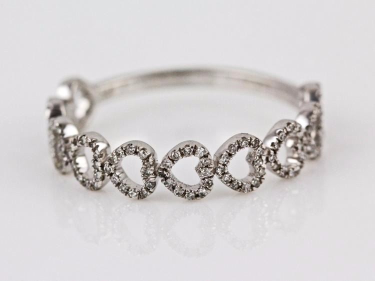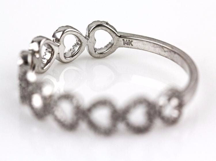 |**Total Carat Weight:0.18|**Clarity:SI2-SI3|**Cut:Verry Good|**Setting: Pave Set |**Main Stone:|**MAIN Stone Treatment:Not Enhanced|**Main Stone Color:|**Main Stone Color:Round|**Theme:|**Length Inches:|**Ring Size:|**Style:Stackable Band|**Metal Purity:14k|**Metal:White Gold|**Gold Weight:1.75g|**Dimension:|**Diamond Color:F-G|**Sizable:|**Sizable:A brand-new, unused, and unworn item (including handmade items) in the original packaging (such as the original box or bag) and/or with the original tags attached|**Remarks:  Colorless Diamonds, With no visible inclusions to the unaided eye.  0.18ct - 120 pcs - 0.7mm Round Clear Diamond (Not Enhanced) SETTING:  Pave Set  HEART DIMENSION: 4.3mm x  4mm each. (10 Hearts) RING WIDTH:  1.5mm Approx. RING HEIGHT: 1.5mm Approx. WEIGHT OF GOLD:  1.75g 14K Solid White Gold - ("14K" Metal Stamp)