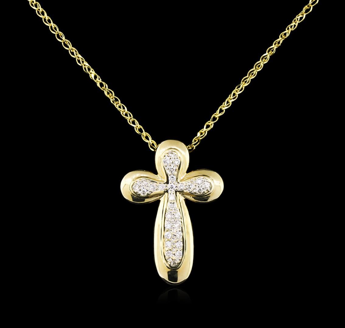One electronically tested 14KT yellow gold lady's combination cast & assembled cross pendant & chain 18.0" long, 1.4mm loose wheat link with a lobster claw clasp with a bright polish finish. Identified with markings of "14K". Condition is new, good workmanship. Containing: Twenty-Nine bead set round brilliant cut diamonds, measuring 1.20 - 1.15 x 0.74mm (depth est.) approximate total weight of 29 Stones = 0.18ct. Graded in the setting. Clarity: SI-1 to SI-2. Color: H - I. Cut Good. Total Weight of Diamonds 0.18ct. Total Weight of Pendant & Chain 5.50gm. GAS Appraised at $1,425.00.