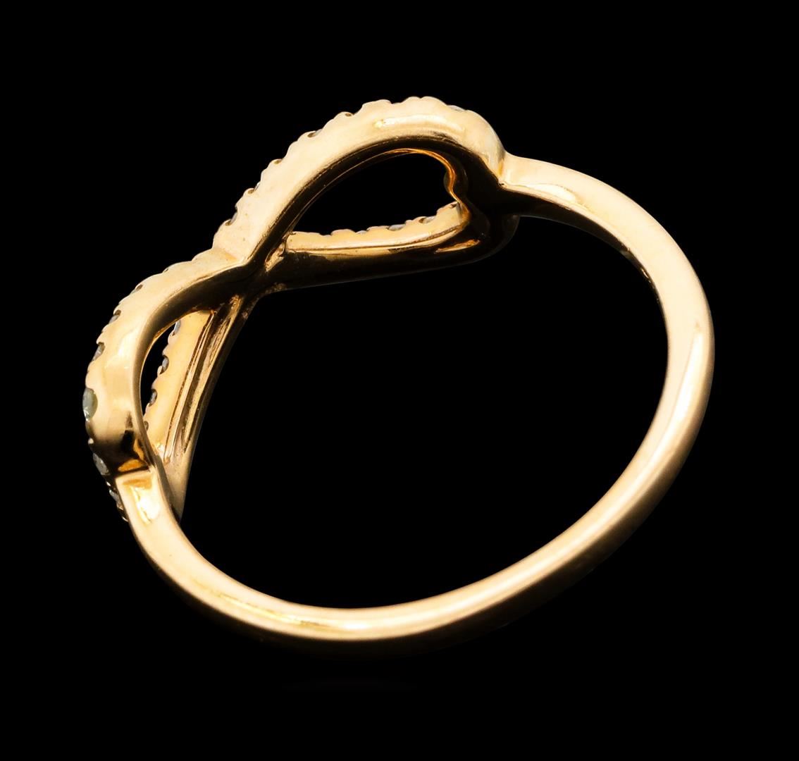 One electronically tested 14KT rose gold lady's cast fashion infinity motif ring with a bright polish finish. The featured lady's ring has a shank measuring 1.20 millimeters wide. Identified with markings of '14K'. Condition is new, good workmanship. Containing: Eight prong set single cut diamonds, measuring 1.30 - 1.20 x 0.77mm (depth est.) approximate total weight of 8 Stones = 0.06ct. Graded in the setting. Clarity SI-2 to I-1. Color: H - I Cut Good Twenty-Three prong set single cut diamonds, measuring 1.15 - 1.05 x 0.68mm (depth est.) approximate total weight of 23 Stones = 0.13ct. Graded in the setting. Clarity SI-2 to I-1. Color: H - I Cut Good. Total Weight of Diamonds 0.19ct.. Total Weight of Ring 1.40gm. GAS Appraised at $765.00.