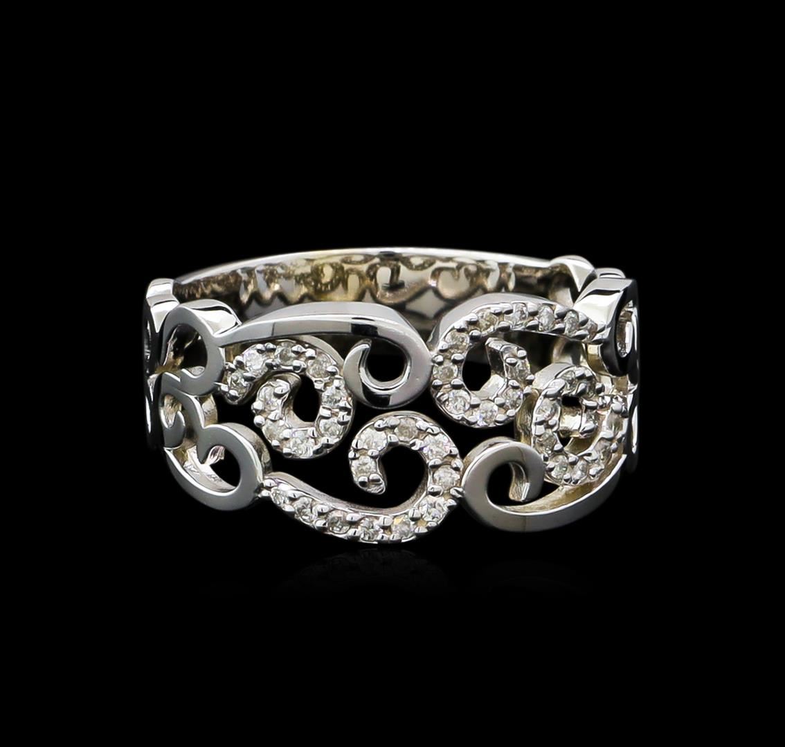 One electronically tested 14KT white gold ladies cast diamond ring with a bright polish finish. The ring features a diamond accented filigree cut-out design supported by tapering shoulders, completed by a four millimeter wide band. Identified with markings of "585". Condition is new, good workmanship. Containing: Forty prong set round brilliant cut diamonds, measuring 1.10 - 1.00 x 0.63mm (depth est.) approximate total weight of 40 Stones = 0.19ct. Graded in the setting. Clarity: I-1 to I-2. Color: G - I. Total Weight of Diamonds 0.19ct. Total Weight of Ring 3.85gm. AIG Appraised.