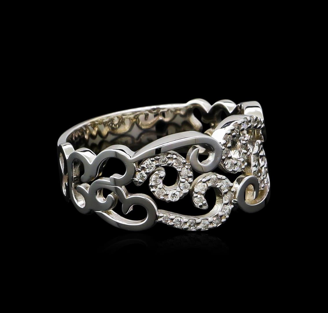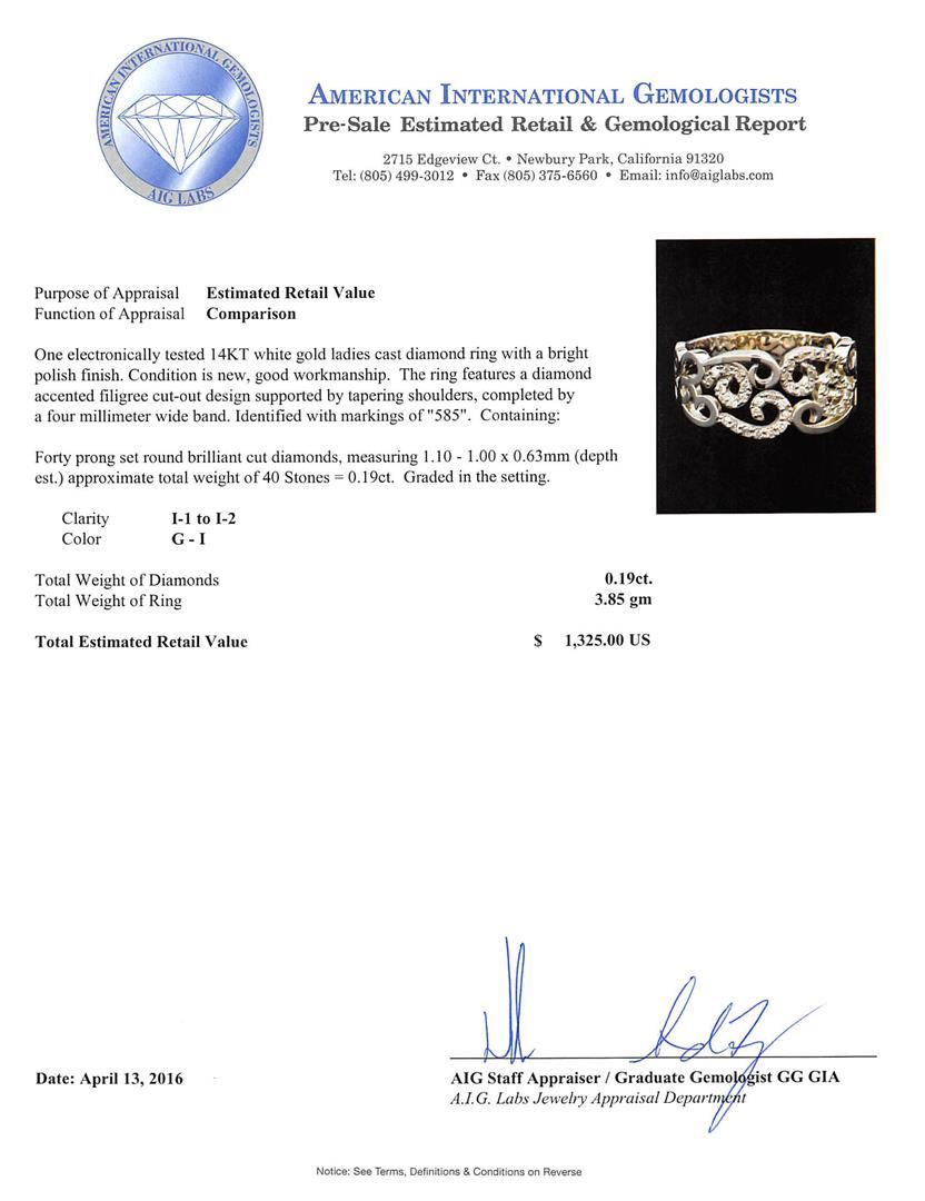 One electronically tested 14KT white gold ladies cast diamond ring with a bright polish finish. The ring features a diamond accented filigree cut-out design supported by tapering shoulders, completed by a four millimeter wide band. Identified with markings of "585". Condition is new, good workmanship. Containing: Forty prong set round brilliant cut diamonds, measuring 1.10 - 1.00 x 0.63mm (depth est.) approximate total weight of 40 Stones = 0.19ct. Graded in the setting. Clarity: I-1 to I-2. Color: G - I. Total Weight of Diamonds 0.19ct. Total Weight of Ring 3.85gm. AIG Appraised.
