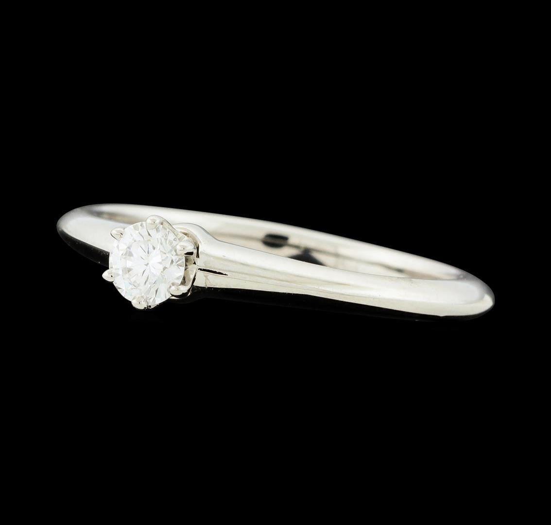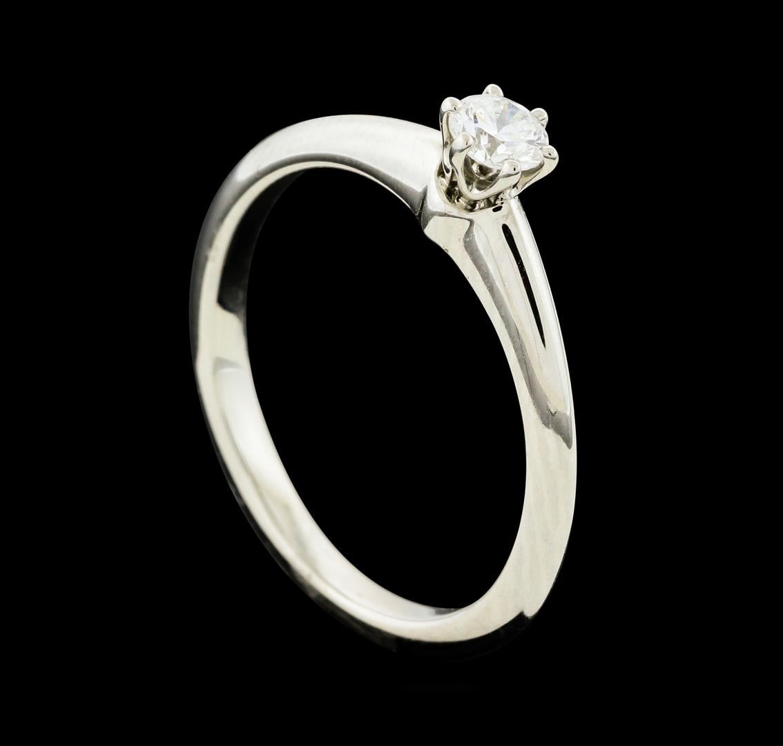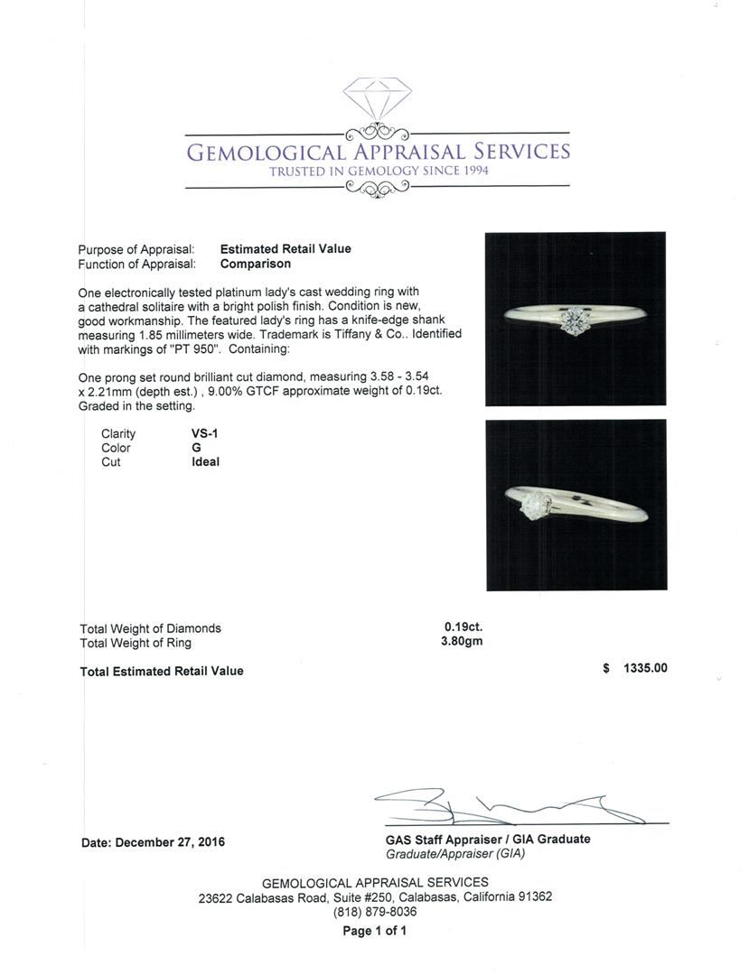 One electronically tested platinum lady's cast wedding ring with a cathedral solitaire with a bright polish finish. The featured lady's ring has a knife-edge shank measuring 1.85 millimeters wide. Trademark is Tiffany & Co. Identified with markings of 'PT 950'. Condition is new, good workmanship. Containing: One prong set round brilliant cut diamond, measuring 3.58 - 3.54 x 2.21mm (depth est.) , 9.00.%. GTCF approximate weight of 0.19ct. Graded in the setting. Clarity VS-1. Color: G Cut Ideal. Total Weight of Diamonds 0.19ct.. Total Weight of Ring 3.80gm. GAS Appraised at $1,335.00.