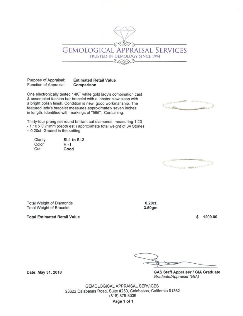 One electronically tested 14KT white gold lady's combination cast & assembled fashion bar bracelet with a lobster claw clasp with a bright polish finish. The featured lady's bracelet measures approximately seven inches in length. Identified with markings of '585'. Condition is new, good workmanship. Containing: Thirty-Four prong set round brilliant cut diamonds, measuring 1.20 - 1.10 x 0.71mm (depth est.) approximate total weight of 34 Stones = 0.20ct. Graded in the setting. Color H - I Clarity SI-1 to SI-2 Cut Good. Total Weight of Diamonds 0.20ct.. Total Weight of Bracelet 3.50gm GAS Appraised at  $1200.00. GAS Appraised.