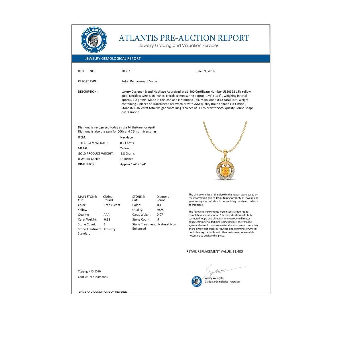REF-22W8F -20362 ---- 0.20 CTW Citrine & Micro Pave VS/SI Diamond Halo Necklace 18K Yellow Gold ---- Luxury Designer Brand Necklace Appraised at $1,400 Certificate Number US20362 18k Yellow gold, Necklace Size is 16 Inches, Necklace measuring approx. 1/4" x 1/4" , weighing in total approx. 1.8 grams. Made in the USA and is stamped 18k, Main stone 0.13 carat total weight containing 1 pieces of Translucent Yellow color with AAA quality Round shape cut Citrine , Stone #2 0.07 carat total weight containing 9 pieces of H-I color with VS/SI quality Round shape cut Diamond