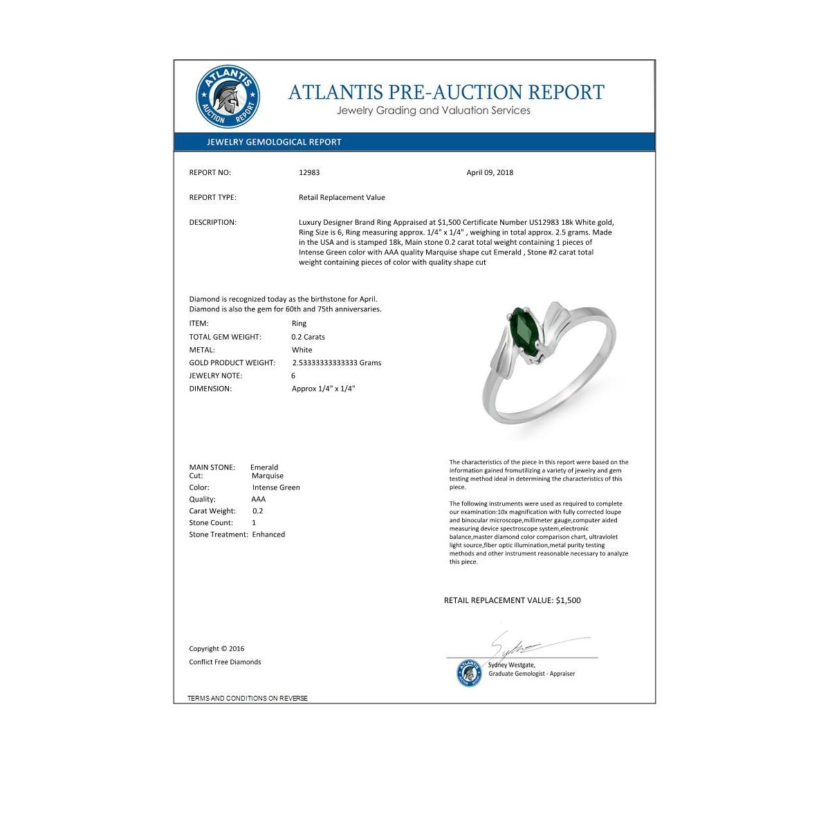 REF-22A5X -12983 ---- 0.20 CTW Emerald Ring 18K White Gold ---- Luxury Designer Brand Ring Appraised at $1,500 Certificate Number US12983 18k White gold, Ring Size is 6, Ring measuring approx. 1/4" x 1/4" , weighing in total approx. 2.5 grams. Made in the USA and is stamped 18k, Main stone 0.2 carat total weight containing 1 pieces of Intense Green color with AAA quality Marquise shape cut Emerald , Stone #2 carat total weight containing pieces of color with quality shape cut