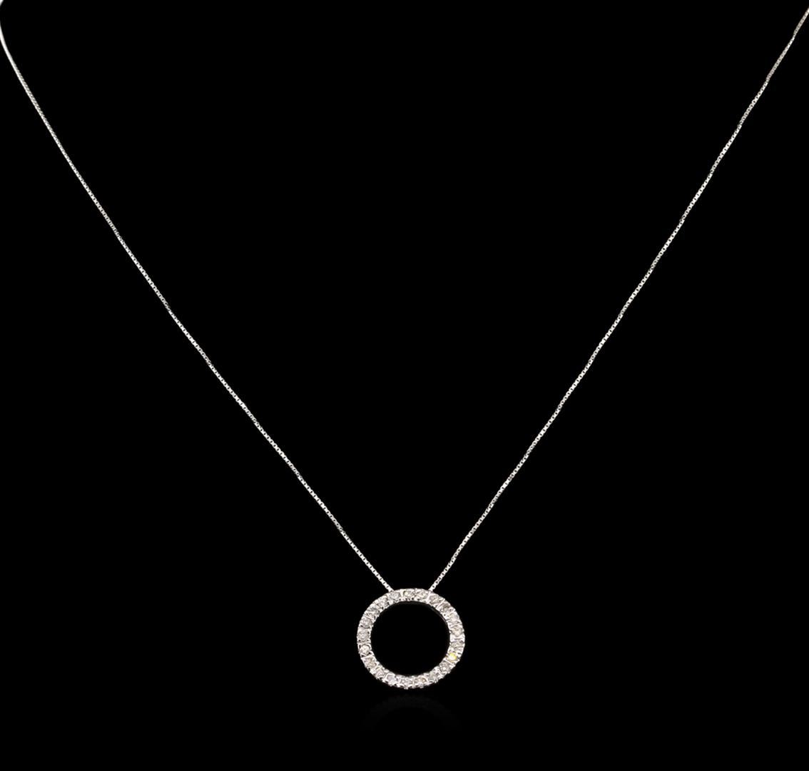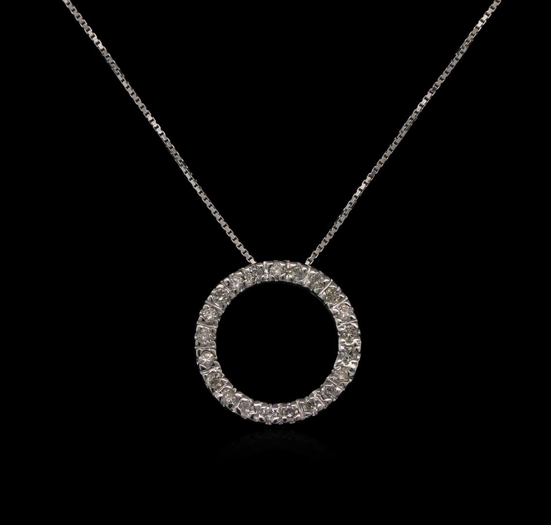 One circle pendant with chain featuring: 14KT white gold weighing 2.93 grams containing pave set round diamonds with a total weight of 0.20ct.