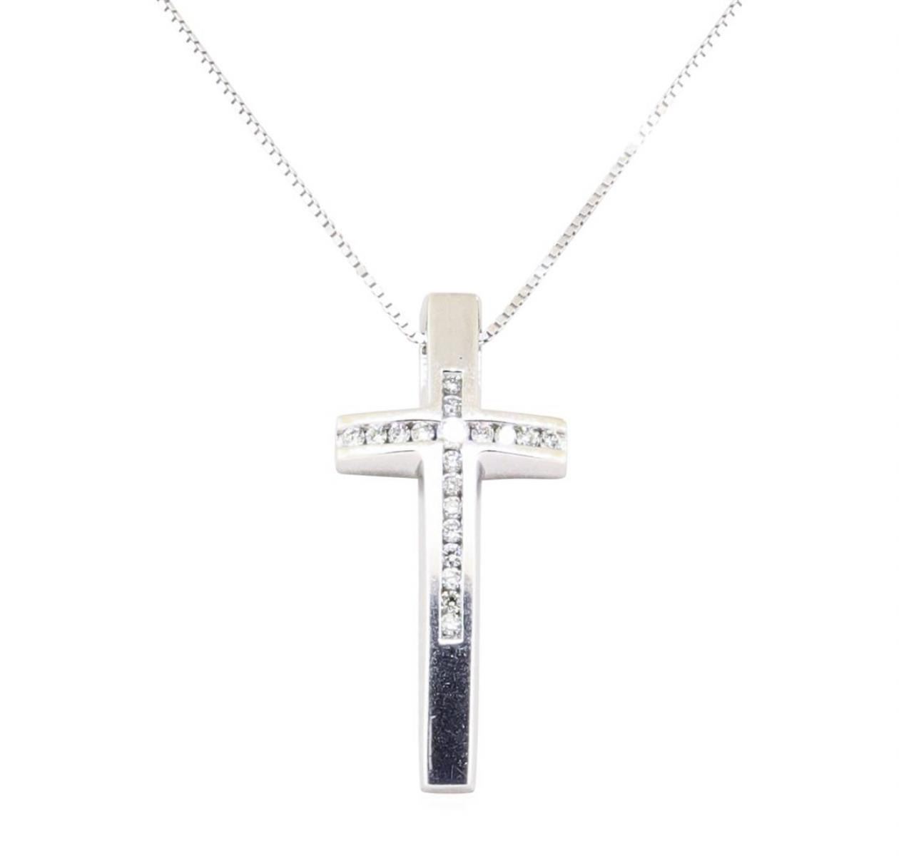 One cross shaped pendant with an attached 14KT white gold chain featuring: 14KT and 18KT white gold weighing 4.6 grams containing diamonds weighing 0.20ctw. The chain is a 0.7mm box link chain measuring sixteen inches in length.