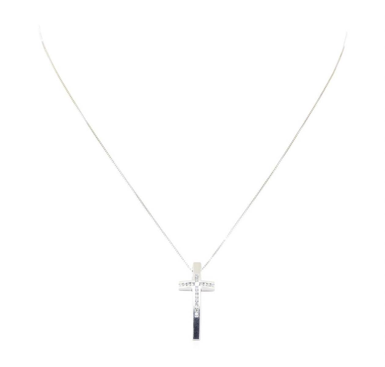 One cross shaped pendant with an attached 14KT white gold chain featuring: 14KT and 18KT white gold weighing 4.6 grams containing diamonds weighing 0.20ctw. The chain is a 0.7mm box link chain measuring sixteen inches in length.