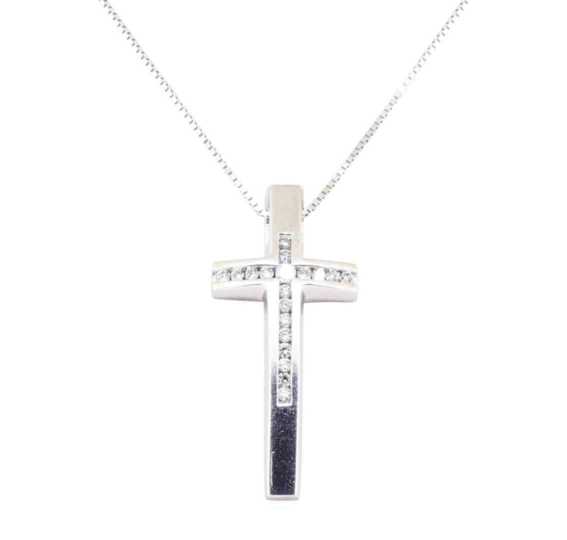 One cross shaped pendant with an attached 14KT white gold chain featuring: 14KT and 18KT white gold weighing 4.6 grams containing diamonds weighing 0.20ctw. The chain is a 0.7mm box link chain measuring sixteen inches in length.