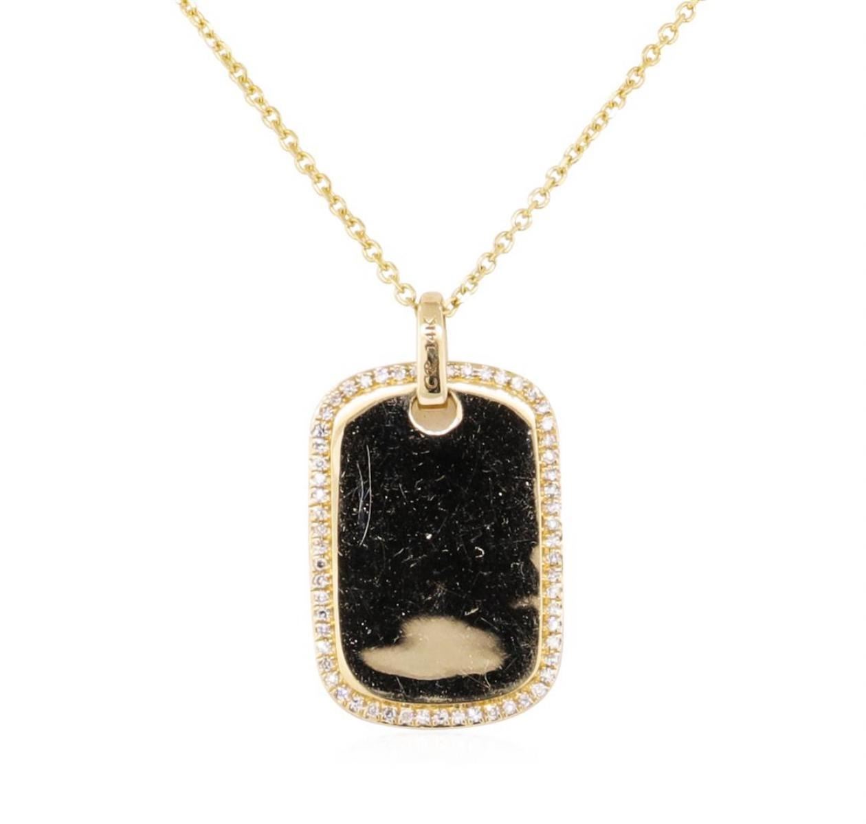 One pendant with chain featuring: 14KT yellow gold weighing 5.8 grams containing diamonds weighing 0.20ctw. The pendant is attached to a sixteen inch long 1mm rounded cable link chain.