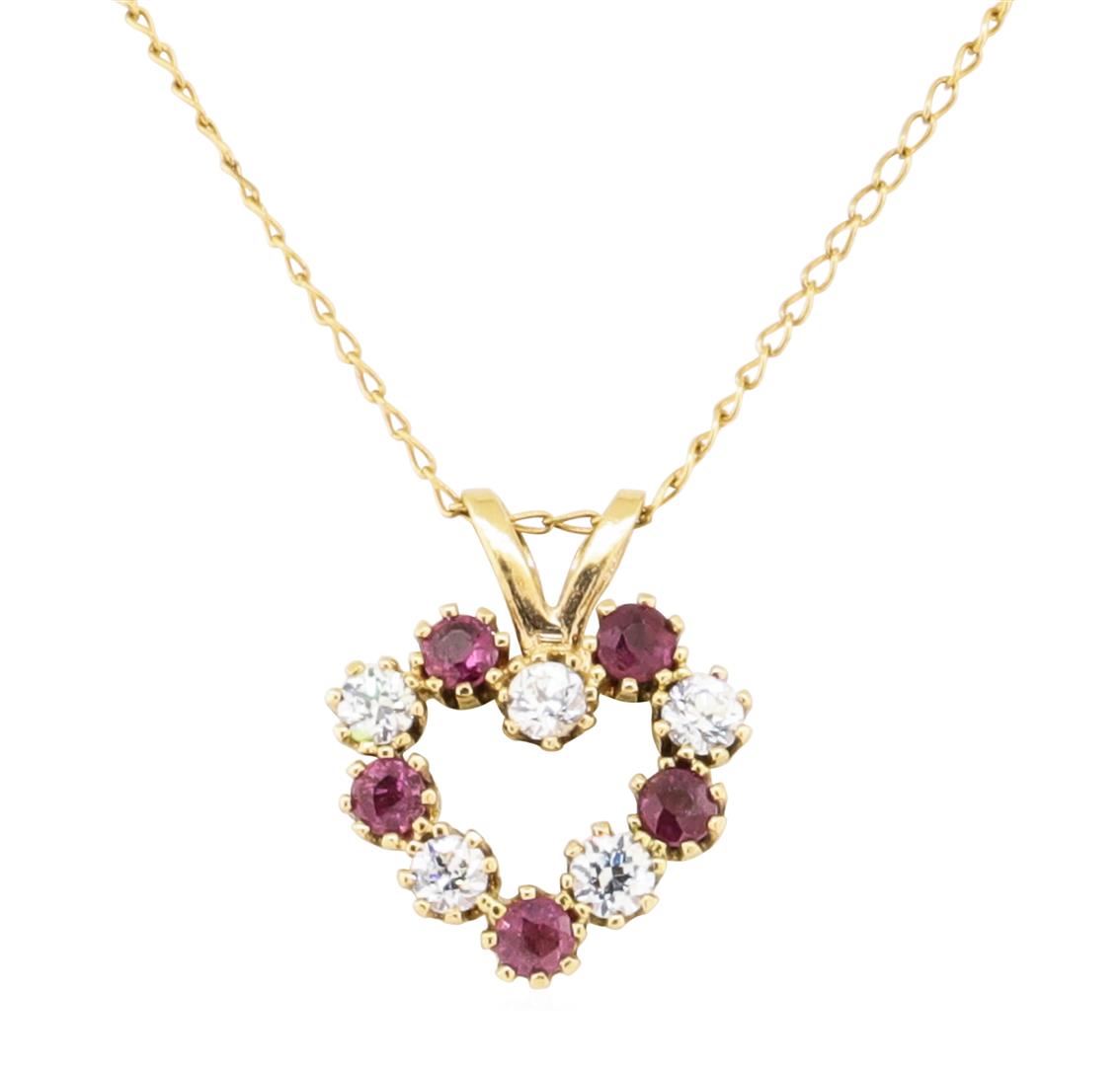 One heart shaped pendant with an attached eighteen inch long cable link chain featuring: 14KT yellow gold weighing 1.3 grams containing diamonds weighing 0.10ctw and rubies weighing 0.10ctw.