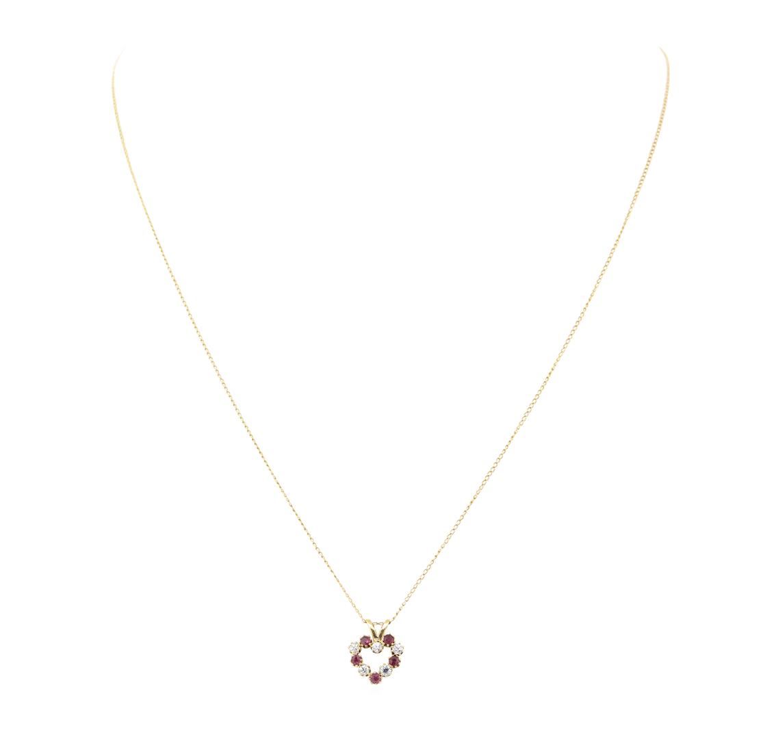 One heart shaped pendant with an attached eighteen inch long cable link chain featuring: 14KT yellow gold weighing 1.3 grams containing diamonds weighing 0.10ctw and rubies weighing 0.10ctw.