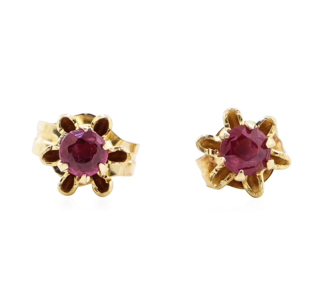 One pair of floral basket earrings featuring: 10KT yellow gold weighing 0.6 grams containing two rubies weighing 0.20ctw.