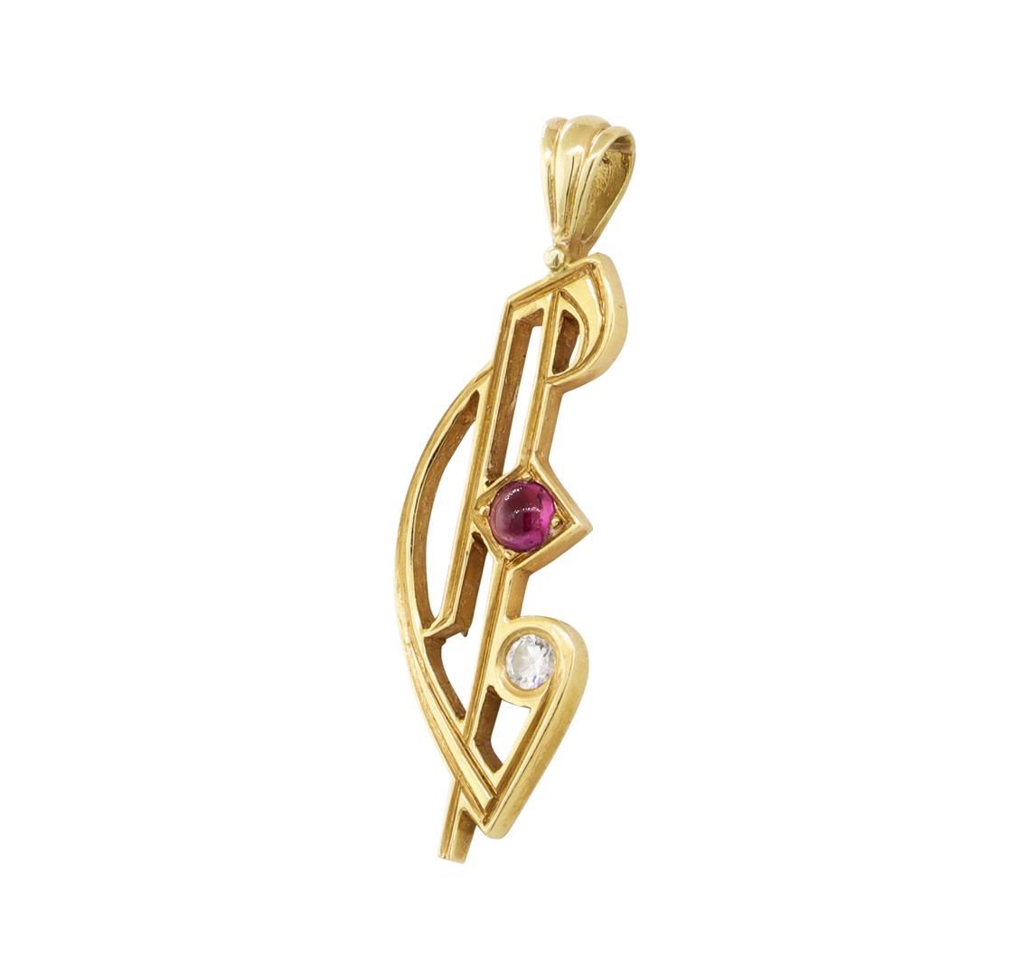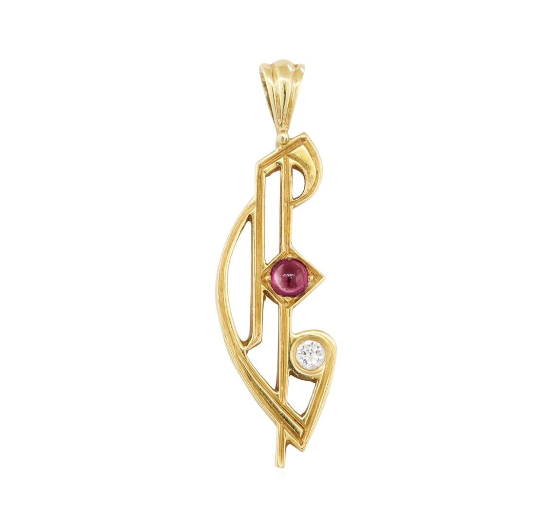 One fashion pendant featuring: 18KT yellow gold weighing 3.0 grams containing one ruby weighing 0.12ct and one diamond weighing 0.08ct.