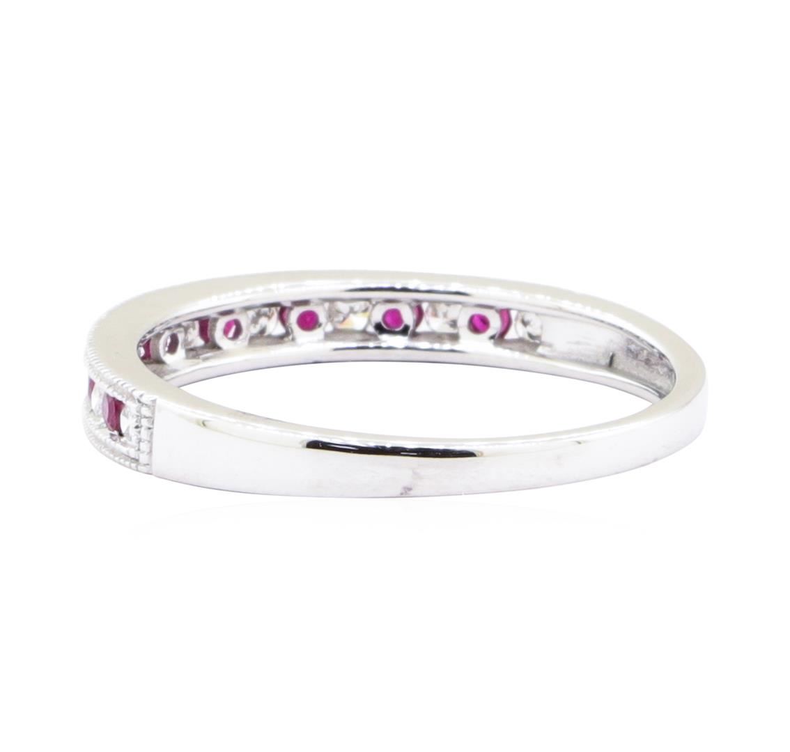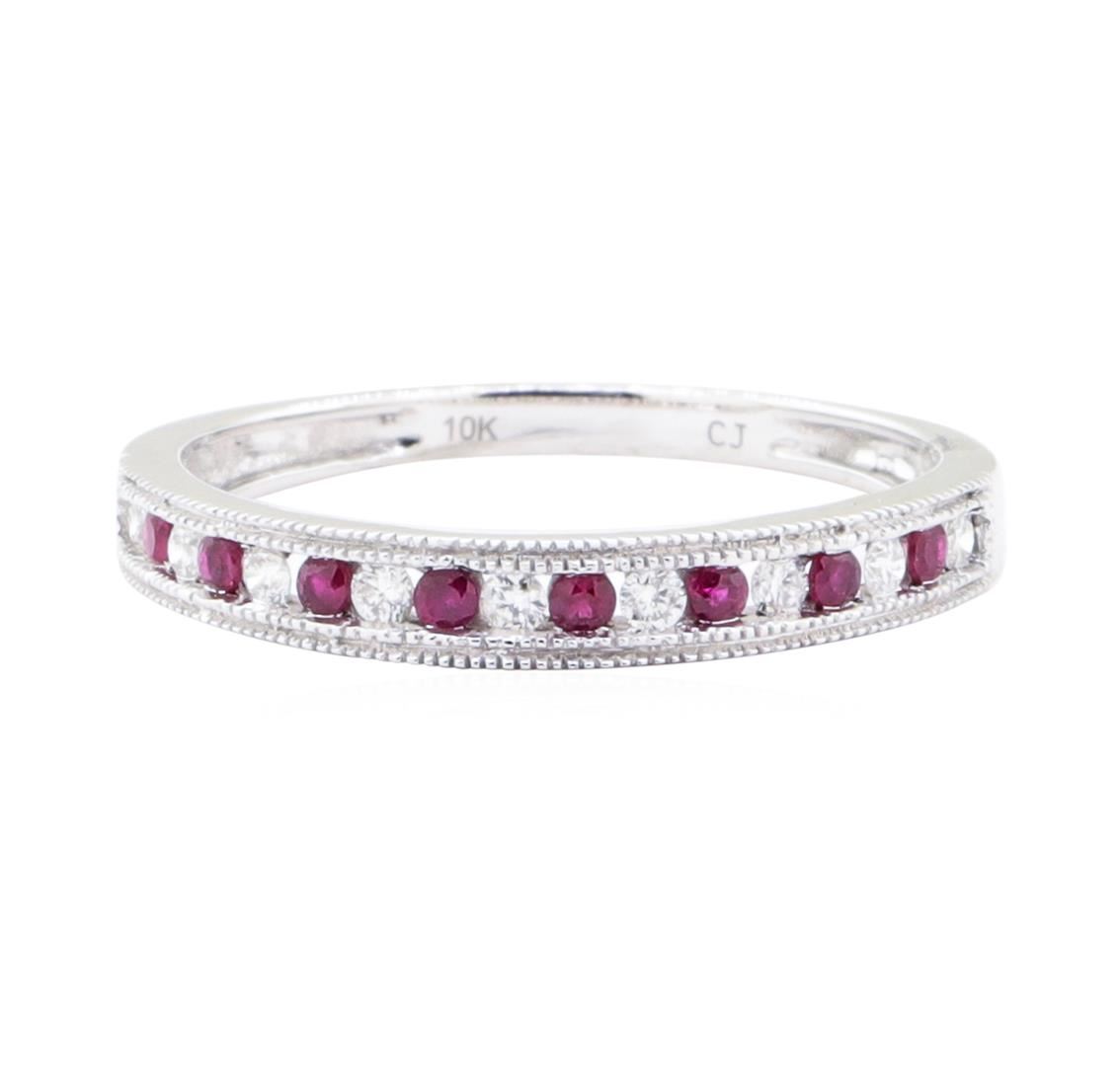 One straight-line double milgrain band featuring: 10KT white gold weighing 1.9 grams containing rubies and diamonds weighing 0.20ctw.