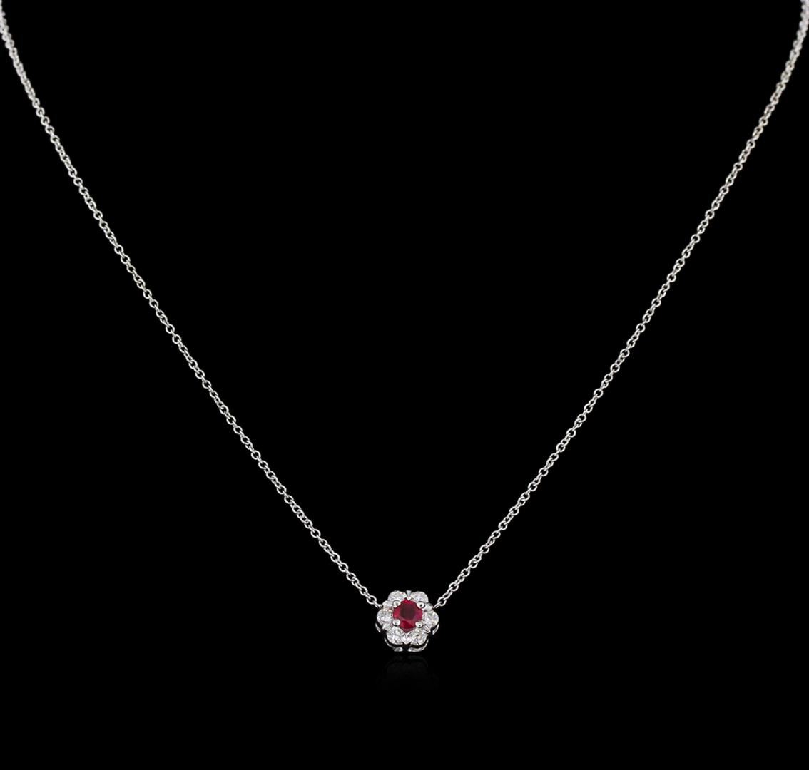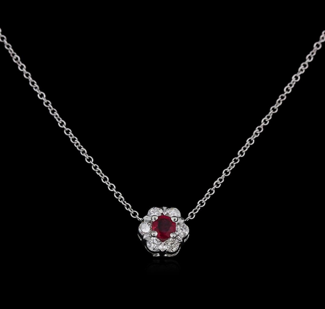 One pendant with chain featuring: 14KT white gold weighing 2.30 grams containing one prong set round ruby center stone with a total weight of 0.20ct and prong set round diamonds with a total weight of 0.35ct.
